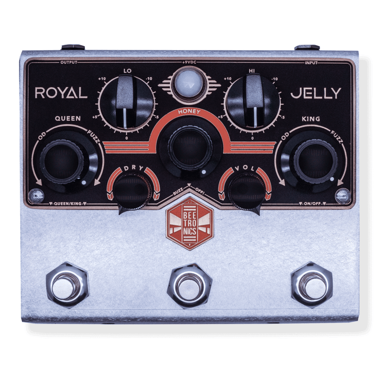 The Royal Jelly is an overdrive/fuzz blender like no other pedal. It can cover any ground from overdrive to fuzz, running two circuits in parallel and giving you the possibility of blending it or having them separately. It also has two presets of the blend, called Queen and King. The presets allow you not only to have two different sounds on the fly, but also make for a very natural transition between them, since instead of switching pedals, you are mixing the levels between your overdrive and fuzz.