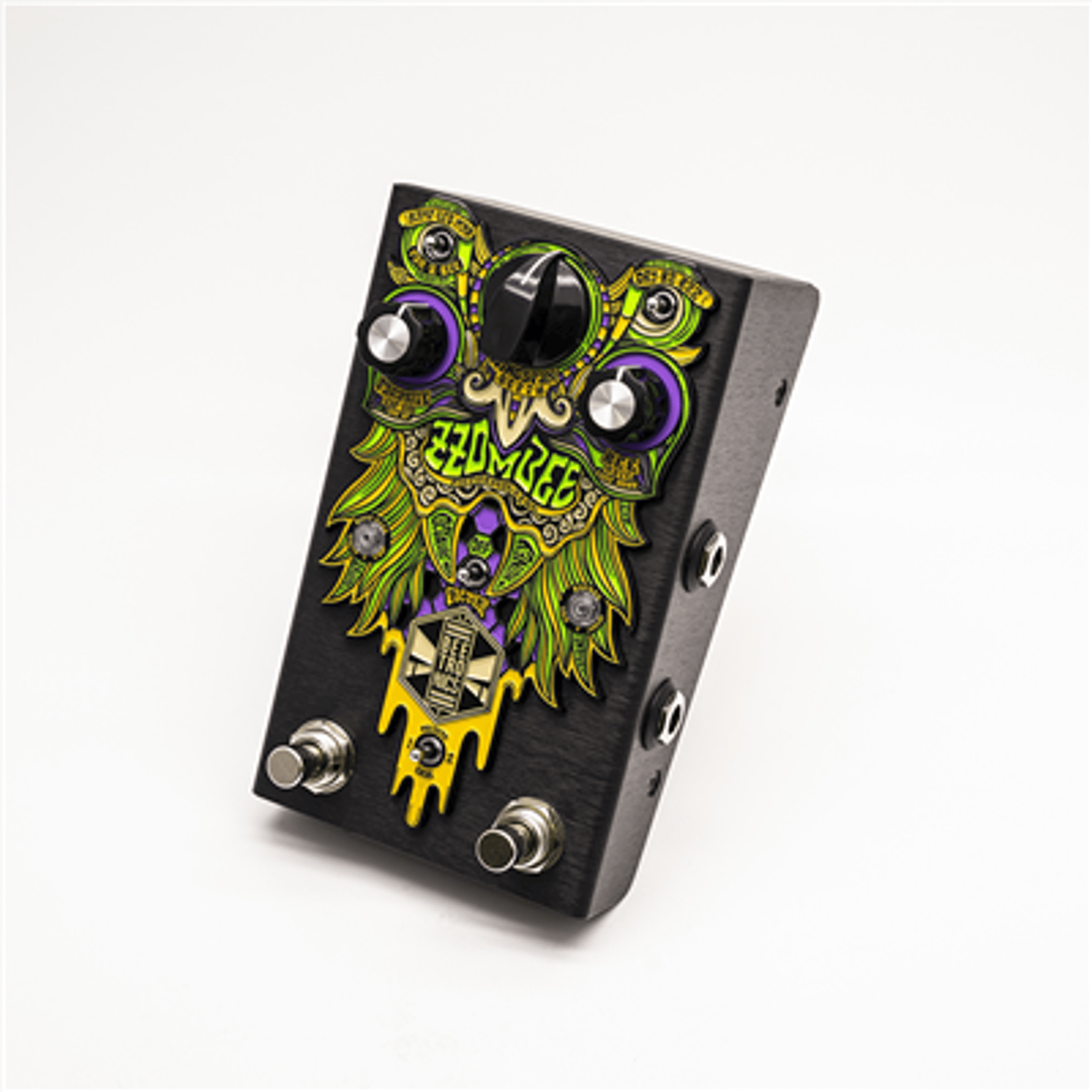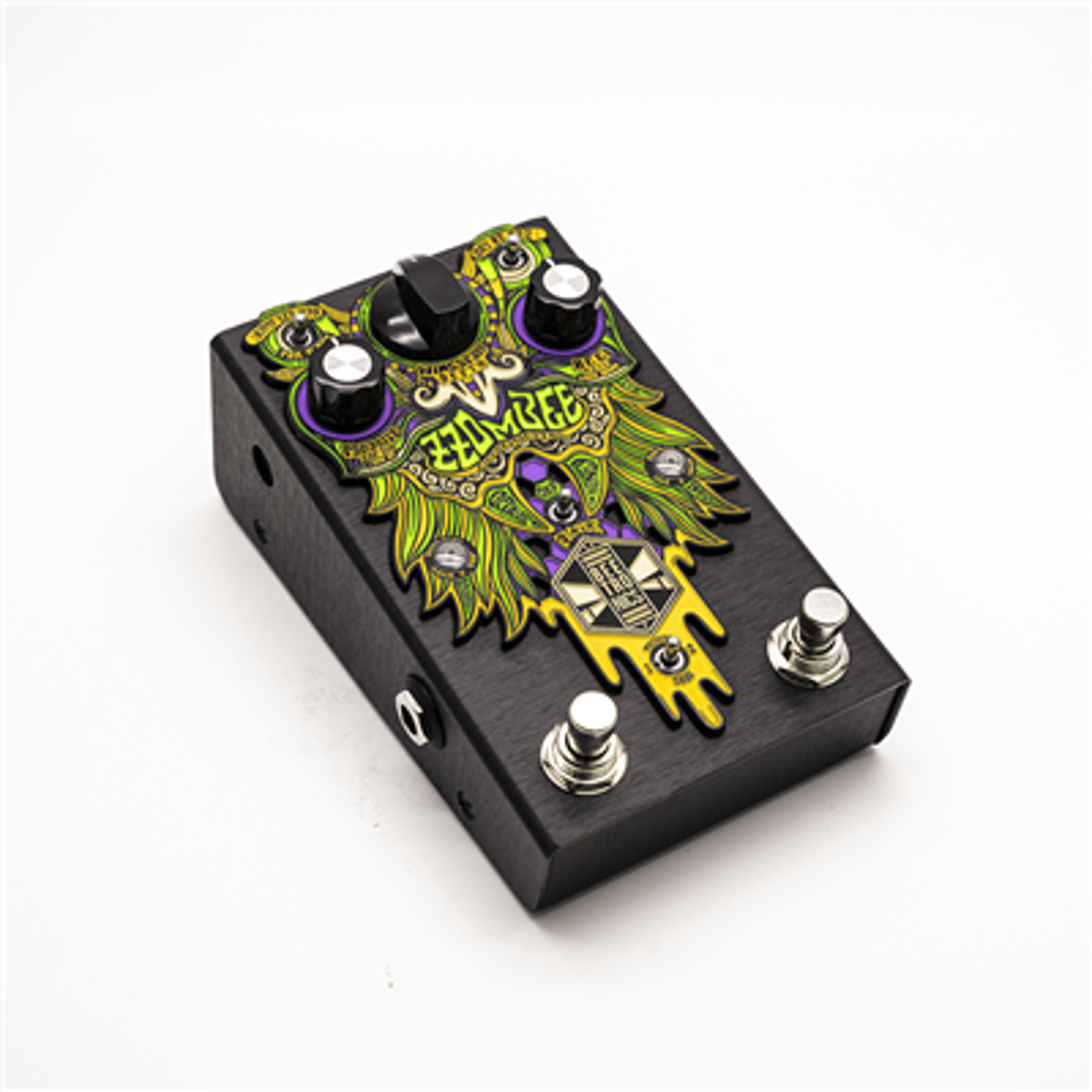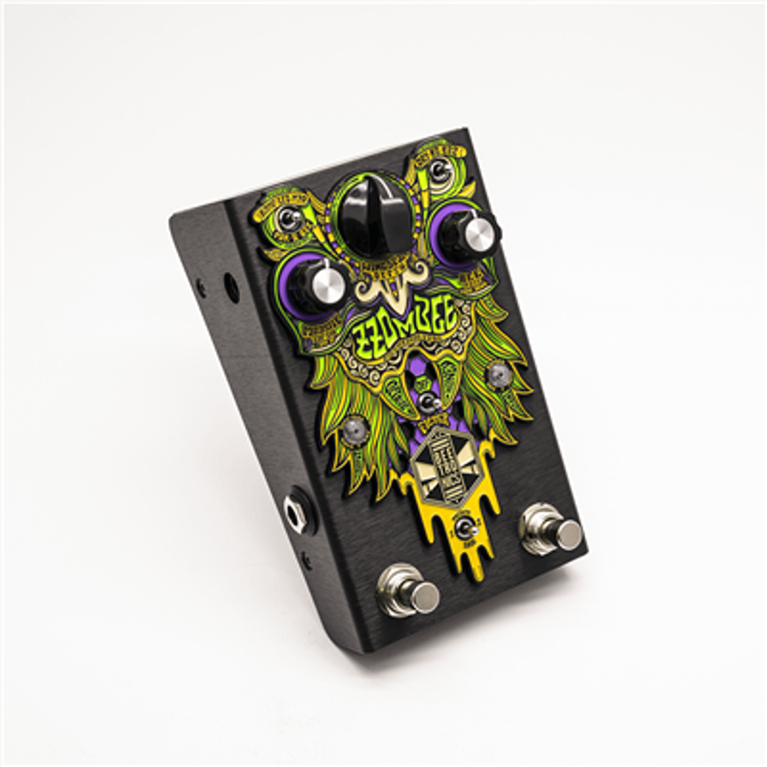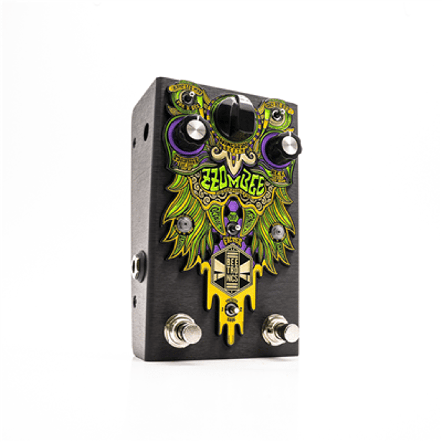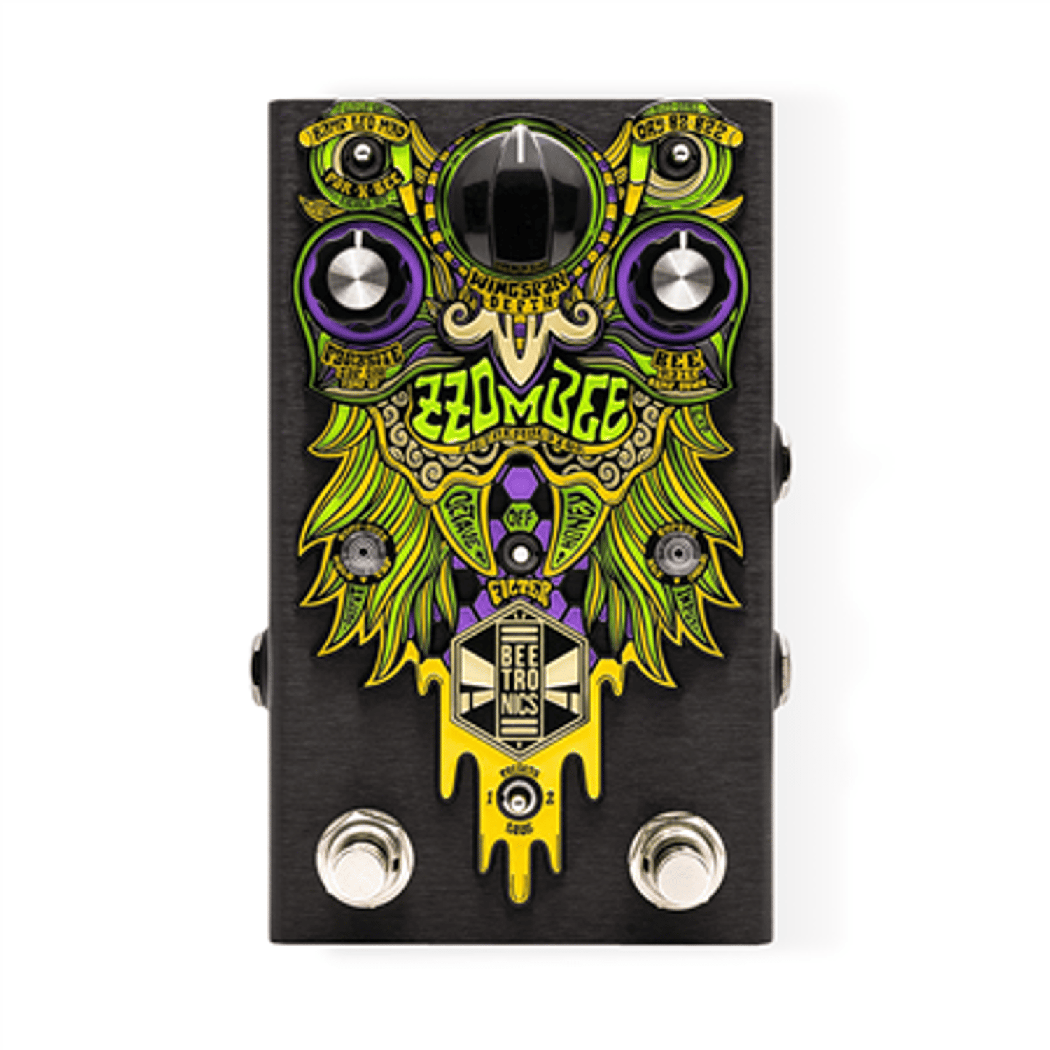 Its unbeeliavable analog tones are enhanced by an innovative way of ramping and controlling modulation movements that uses a momentary footswitch in the most musical ways. These controls make the pedal an extension of your instrument, beecoming an essential tool to expand your creativity. The sounds found in the Zzombee are very unique and would require a very complex rig to be recreated. Thats because the instrument signal gets a 4 stage gain buzz selection and runs in parallel to a monophonic low octave beeast, in the most beetronical style. The filter can be applied to either of these with the other remaining untouched.