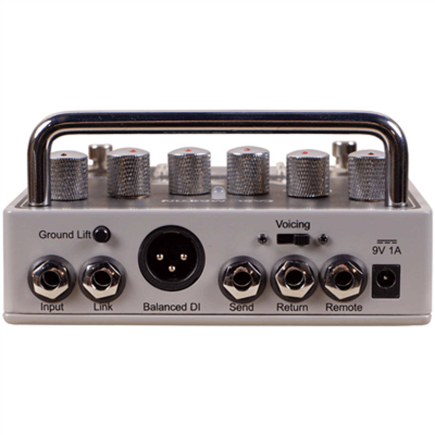 On the back of the pedal you will find a Ground Lift and a Voicing Switch (a subtle low end cap controlled voicing adjustment). Input, Link (output to your amp or powered speaker) Balanced DI (XLR output to go to a mixing or recording console), a Send and Return for those specific effects that shouldn’t be in front of the amp, a Remote Input for use with digital or analog effect controllers like the Carl Martin Octaswitch ‘The Strip’, and your standard 9v 1A power input.