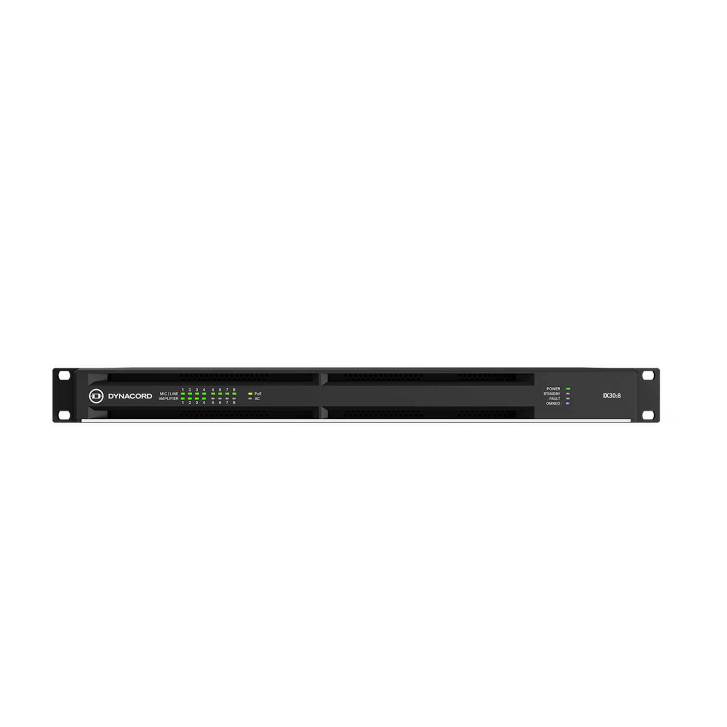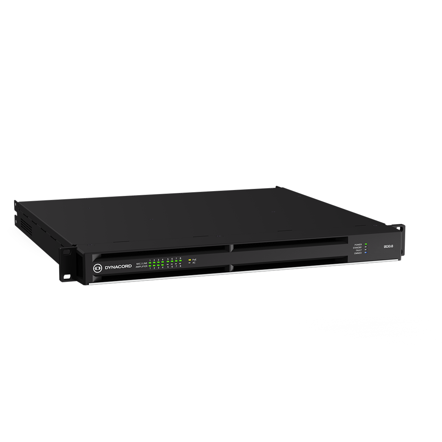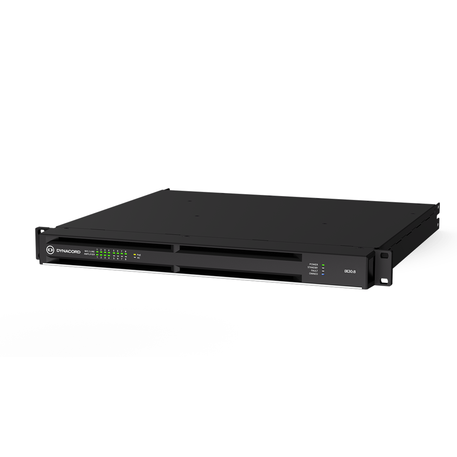 8-channel networked DSP amplifier with 3 kW powerTANK for Hi-Z and Lo-Z operation8 x 8 Dante with OCA/AES70 remote control, 8 mic/line inputs usable as Dante break-in96 kHz fully featured DSP matrix mixer and MXE-style TaskEngine for system logic, automation, scheduling and integration ghostPOWER via PoE to maintain DSP, Dante network and mic/line inputsHigh efficiency ecoRAIL technology for lower operating costsThe IX30:8 is an 8-channel networked DSP amplifier with 3 kW total output power. Capable of driving Hi-Z or Lo-Z loads with powerTANK technology, the IX30:8 is ideal for a wide range of applications including sports venues, houses of worship, live performance spaces and hospitality.IX30:8 features eight (8) Dante inputs, eight (8) Dante outputs and eight (8) mic/line inputs that can be used as Dante break-in points. The natively operating 96 kHz DSP features a fully equipped 16 x 16 matrix mixer, EQs, dynamics, Dynacord FX and FIR-Drive capability. All 16 inputs feature pilot-tone detection, while the eight (8) Dante and eight (8) amplifier outputs allow to add pilot tones up to 30 kHz.The IX30:8 uses Dynacord‘s patented ecoRAIL technology for optimizing energy consumption. ghostPOWER via POE maintains the entire DSP, the Dante network and all mic/line inputs active, independent of the mains power. The integrated MXEstyle TaskEngine allows for system automation, scheduling, control, and integration to third party devices.IX series is fully integrated in Dynacord‘s SONICUE Sound System Software and can be used as a SONICUE control server, for direct use with the WPN1 wall panel as well as TPC-1, iOS and Windows devices.