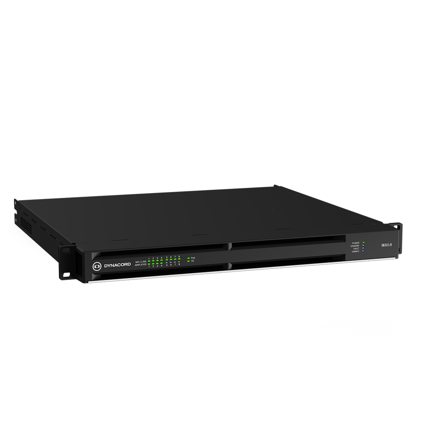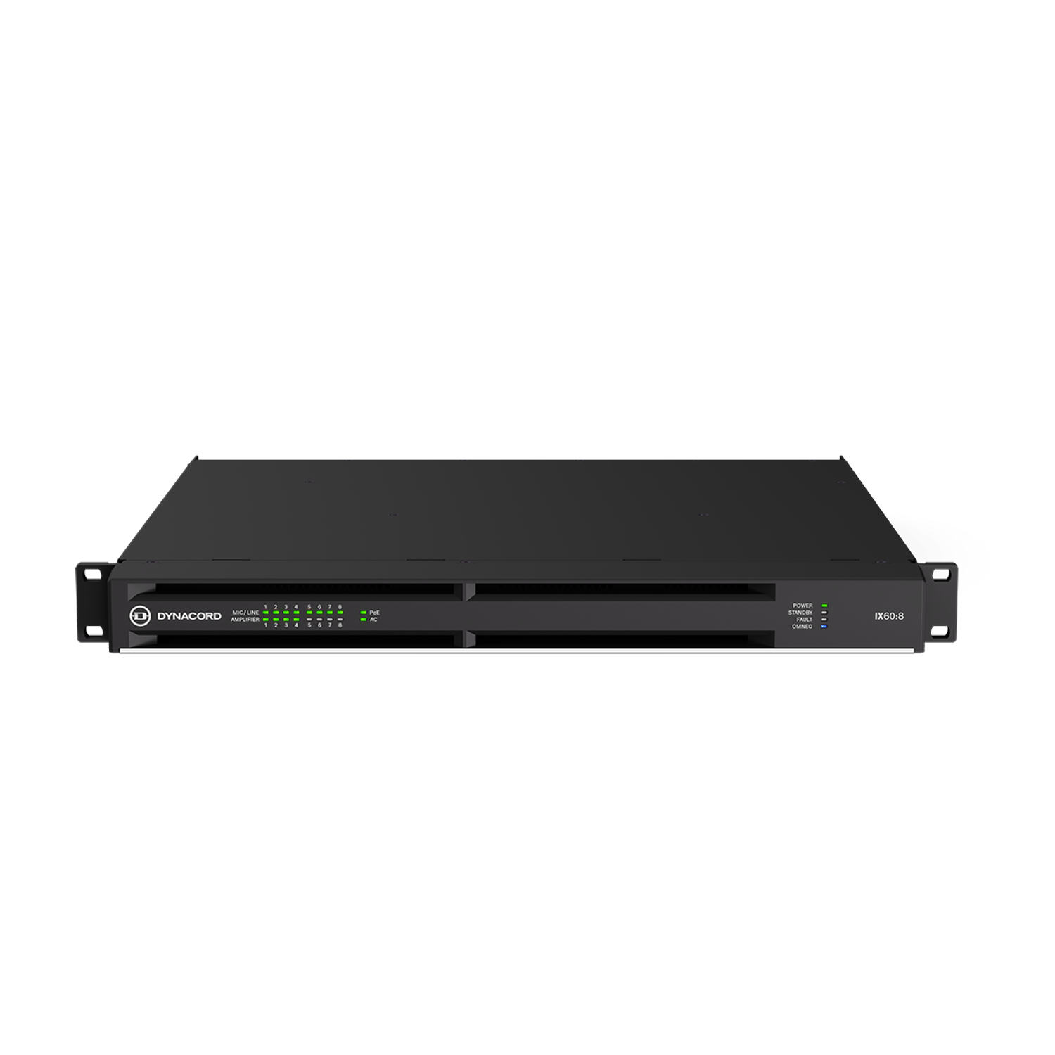 8-channel networked DSP amplifier with 6 kW powerTANK for Hi-Z and Lo-Z operation8 x 8 Dante with OCA/AES70 remote control, 8 mic/line inputs usable as Dante break-in96 kHz fully featured DSP matrix mixer and MXE-style TaskEngine for system logic, automation, scheduling and integrationghostPOWER via PoE to maintain DSP, Dante network and mic/line inputsHigh efficiency ecoRAIL technology for lower operating costsThe IX60:8 is an 8-channel networked DSP amplifier with 6 kW total output power. Capable of driving Hi-Z or Lo-Z loads with powerTANK technology, the IX60:8 is ideal for a wide range of applications including sports venues, houses of worship, live performance spaces and hospitality.IX60:8 features eight (8) Dante inputs, eight (8) Dante outputs and eight (8) mic/line inputs that can be used as Dante break-in points. The natively operating 96 kHz DSP features a fully equipped 16 x 16 matrix mixer, EQs, dynamics, Dynacord FX and FIR-Drive capability. All 16 inputs feature pilot-tone detection, while the eight (8) Dante and eight (8) amplifier outputs allow to add pilot tones up to 30 kHz.The IX60:8 uses Dynacord‘s patented ecoRAIL technology for optimizing energy consumption. ghostPOWER via POE maintains the entire DSP, the Dante network and all mic/line inputs active, independent of the mains power. The integrated MXEstyle TaskEngine allows for system automation, scheduling, control, and integration to third party devices.IX series is fully integrated in Dynacord‘s SONICUE Sound System Software and can be used as a SONICUE control server, for direct use with the WPN1 wall panel as well as TPC-1, iOS and Windows devices.