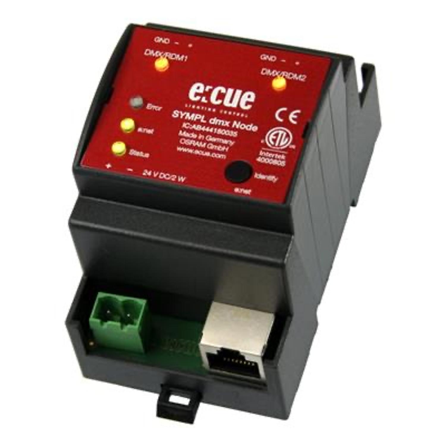 The SYMPL dmx Node is a two-channel DMX and RDM interface which can be used with e:cue’s lighting control software SYMPHOLIGHT. It provides two independent DMX/RDM universes for up to 1024 channels. The SYMPL dmx Node is supplied with voltage via an external adaptor or through Power-over-Ethernet (PoE). It is easily mounted onto standard 35 mm DIN rails or a suspension hole in the housing base, on walls, or on any other solid vertical surface. The SYMPL dmx Node is a straightforward, reliable and easy to use interface solution for SYMPHOLIGHT.