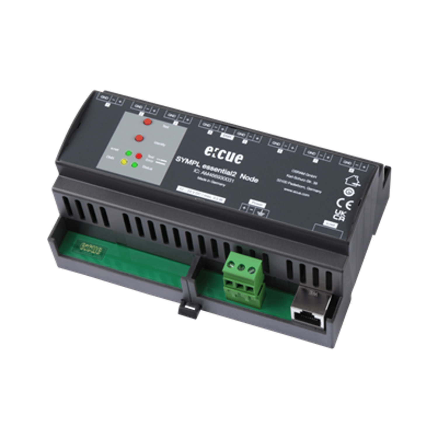 e:cue SYMPL Nodes are a system of interfaces for e:cue SYMPHOLIGHT only. They provide various connection types like DMX512, DALI, digital inputs and outputs etc. SYMPL Nodes always operate in online mode, as a device interface for SYMPHOLIGHT. All interactions are initiated and controlled by SYMPHOLIGHT. Connections between servers and Nodes are always made with e:net via Ethernet.The SYMPL essential2 Node is the dedicated output device for a high amount of controllable channels. It comes with 8 x DMX universes over screw terminal plugs.The SYMPL essential2 Node is especially designed for the control of medium to large size DMX installations. Over Ethernet within SYMPHOLIGHT or the LAS, the SYMPL essential2 Node makes it possible to run up to 4096 (8 x 512) DMX512 channels (= 1360 (8 x 170) RGB Pixel) - or only within SYMPHOLIGHT up to 8192 (8 x 1024) FastDMX channels (= 2728 (8 x 341) RGB Pixel). In addition, the SYMPL essential2 Node provides Test modes for checking the installation.The SYMPL essential2 Node is powered by an external power supply or via Power-over-Ethernet (PoE). It is easily mounted on standard 35 mm DIN rails, or via suspension holes in the base plate of the housing for mounting on walls or any vertical surfaces.