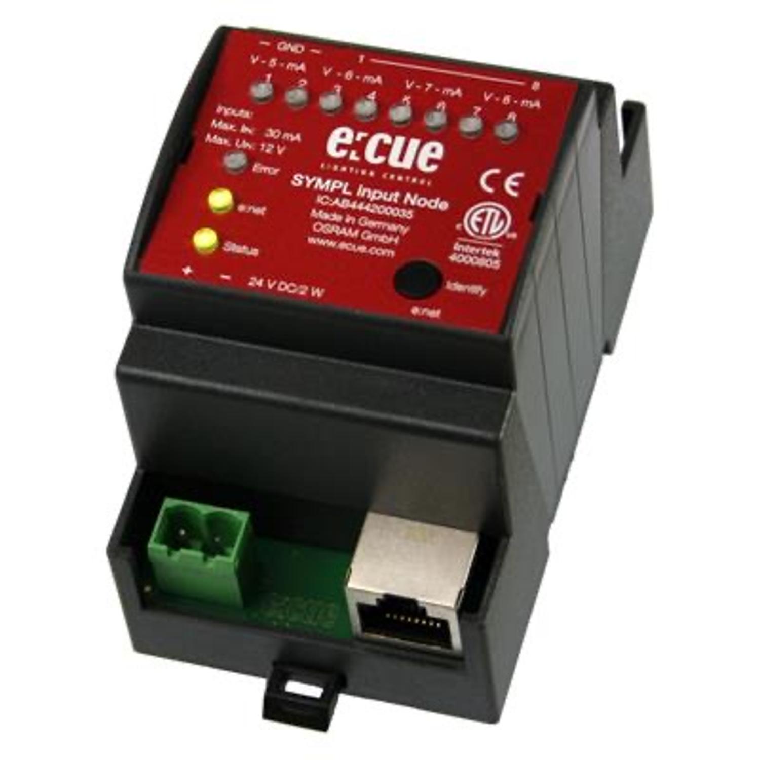 The e:cue SYMPL input Node is an eight-channel analog input interface which can be used with e:cue’s lighting control software SYMPHOLIGHT. It provides eight independent analog 10 V inputs, whereas four of them also support a 20 mA constant current input, which can be configured by operating a slide switch. The e:cue SYMPL input Node is supplied with voltage via an external adaptor or through Power-over-Ethernet (PoE). It is easily mounted onto standard 35 mm DIN rails or a suspension hole on the back on any solid vertical surface. The e:cue SYMPL input Node is a straightforward, reliable and easy to use interface solution for SYMPHOLIGHT.