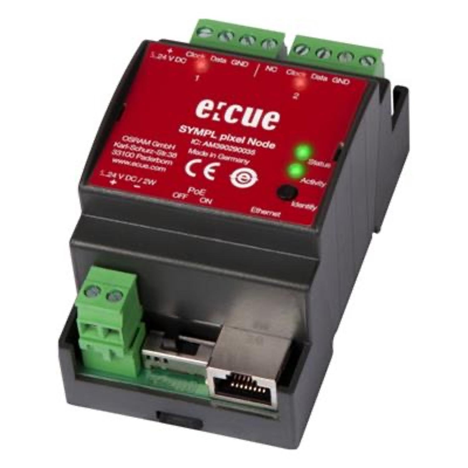 The SYMPL pixel Node is an LED pixel controller which supports various serial addressable LED pixel products like strips, dots and boards with individually controllable pixels. It can control a wide range of asynchronous and synchronous protocols (SPI). You can create content using our software e:cue SYMPHOLIGHT (optional).The SYMPL pixel Node comes with two pixel outputs with screw terminals. For each of the two outputs, you can configure the pixel protocol separately. With the SYMPL pixel Node, it is possible to run up to 2 x 2048 channels (=4096 in total, = 1364 RGB pixels). You can cover distances of up to 300 m between the pixel Node and the lighting fixture with the optional Pixel Range Extender.