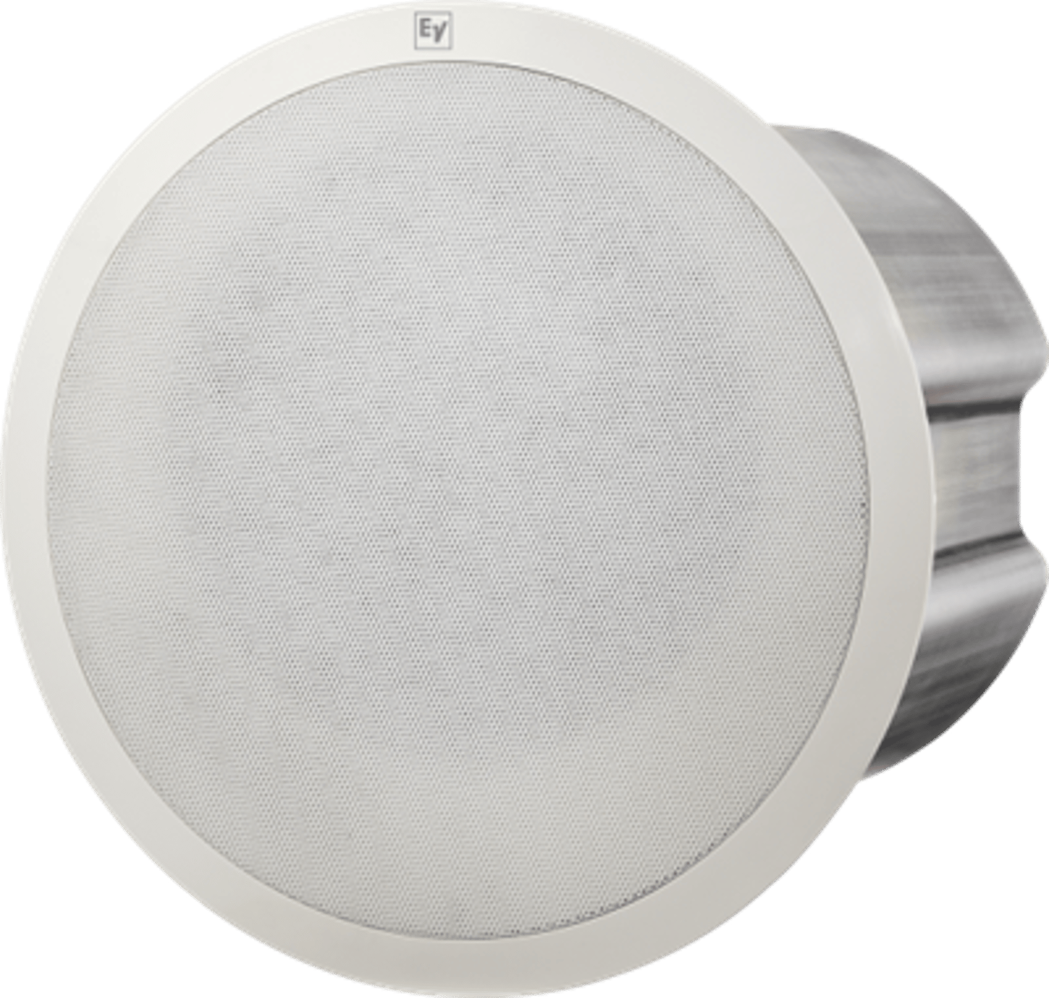 The EVID PC8.2E speaker system from Electro-Voice is a complete high performance two-way ceiling speaker package. The EVID PC8.2E is ideal for background and foreground music, voice evacuation, paging, and sound reinforcement applications. All EVID Premium Ceiling Speaker models provide a unique combination of high acoustic output, superb coverage control, high power handling and wide dispersion, to cover virtually any size listening area. The EVID PC8.2E comes completely assembled with an integrated bezel assembly, grille, rear enclosure, 8-inch (200 mm) coaxial two-way speaker and internal high power line-matching transformer. The speaker features a waveguide coupled true compression HF driver and a long excursion 8-inch (200 mm) woofer. The EVID PC8.2E utilizes a transformer that offers a selection of 7.5 W (70-V only), 15, 30 or 60 watts delivered to the speaker system using either 70-V or 100-V lines, or 8 ohm bypass. Selection is via a convenient switch on the front baffle. The perforated grille is fully zinc plated and finished in semi-gloss white powder-coated enamel. The baffle and bezel are constructed from fire rated ABS. The rear enclosure is constructed from zinc-plated, heavy gauge steel. The rear enclosure, with fiberglass damping material, provides an optimum internal volume for extended low-frequency performance. A rear cover, with provisions for a junction box fitting, provides access to a 4-pin terminal block that allows direct connection to the speaker with up to 2.5 mm (12 AWG) wire and provides pass through to additional speakers. The rear input cover for EN54 is used to create a seal to protect the ceiling speaker from moisture and foreign particles, if properly installed. The weatherized terminal cover must be used in all EN54 installations. Two adjustable metal tile bridges and metal “C” ring are included for safe suspension of the EVID PC8.2E ceiling systems in a drop ceiling that uses mineral wool, or other fiber based ceiling tiles. The wide range of EVID ceiling speakers has been designed to work together as a complete system in a variety of different ceiling constructions.Read more