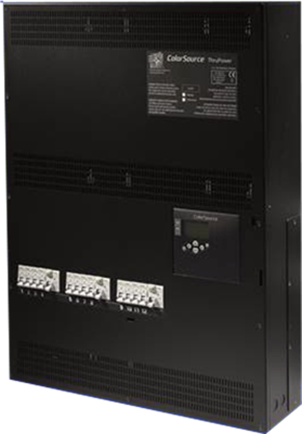ColorSource ThruPower provides up to 24 circuits of DMX controlled power in a fanless, convection cooled wall mount cabinet. As a member of the ColorSource family, the power system is designed to allow schools, theatres, and other entertainment lighting customers to control their transition to LED lighting without later expensive revisions to their power infrastructure. Its user-friendly design provides access to change between constant , relay or dimmed circuit via RDM - or at the touch of a button directly at the cabinet.Read more