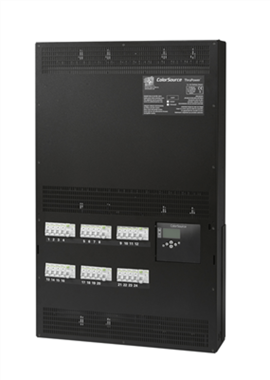 ColorSource ThruPower provides up to 24 circuits of DMX controlled power in a fanless, convection cooled wall mount cabinet. As a member of the ColorSource family, the power system is designed to allow schools, theatres, and other entertainment lighting customers to control their transition to LED lighting without later expensive revisions to their power infrastructure. Its user-friendly design provides access to change between constant , relay or dimmed circuit via RDM - or at the touch of a button directly at the cabinet.Read more