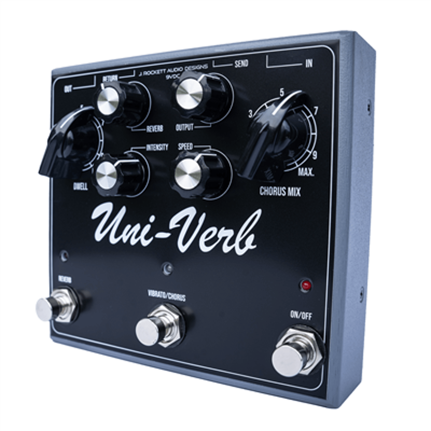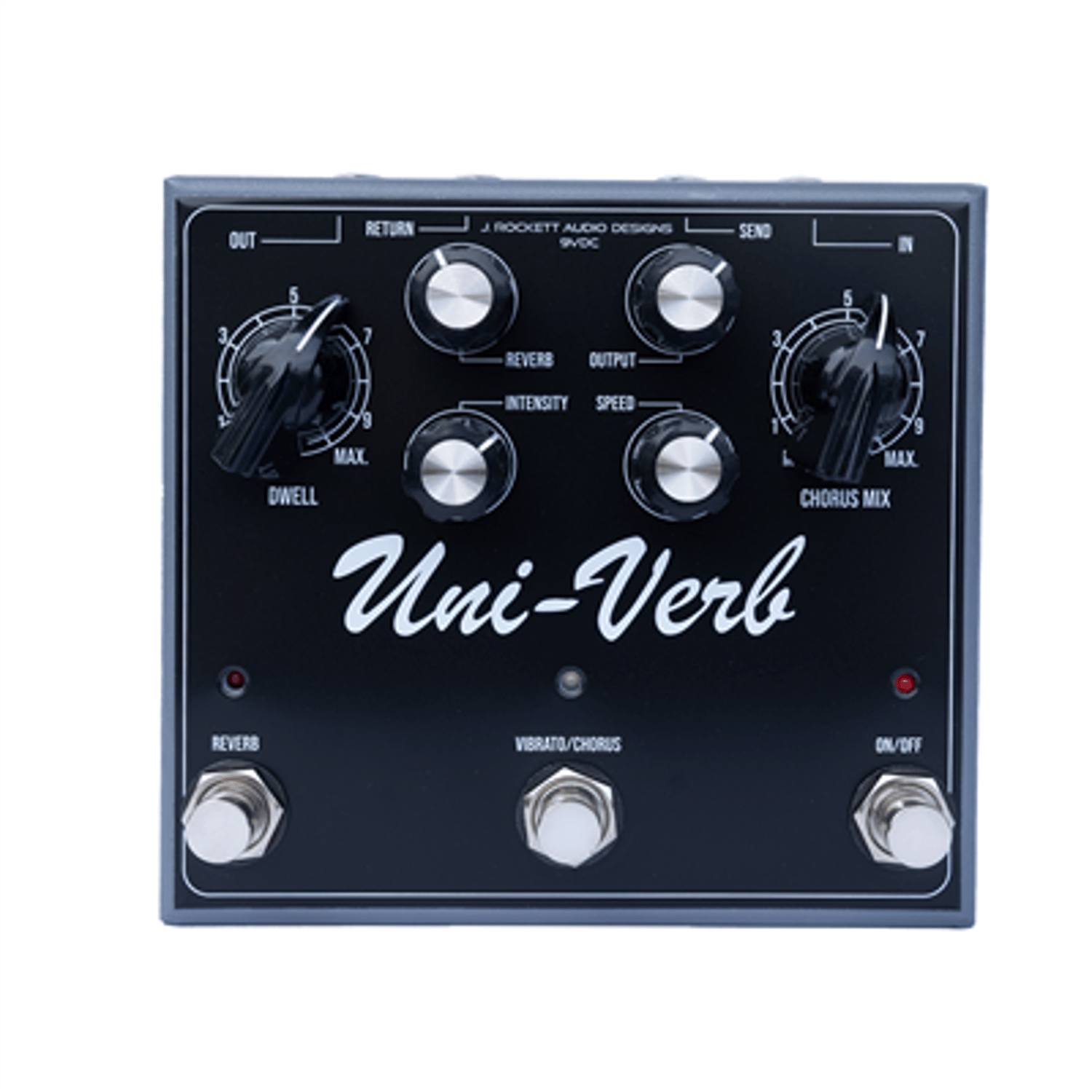 Experience the legendary analog tones of the original Univibe with modern functionalities. The Uni-Verb is a modern twist on the classic Univibe. However, we have added features to enhance the already amazing effect you get. The Uni-Verb recreates the classic sounds you would expect but we have also added a vintage spring tank reverb to make it drip even more. The Uni-Verb runs at 24v just like the original but that is achieved internally. You only need to use a standard negative tip 9v supply making it much more convenient without having to fuss with conversion. The classic Univibe sounded best before drives and other effects, so we built in a loop enabling you to separate the Vibe and Reverb. Both effects can be run individually or together. Some of the features of a classic Univibe left it a little basic such as a lack of control over the turnaround thump of the effect. The Uni-Verb has two separate controls for the chorus section (Chorus Mix and Intensity) allowing complete control over the intensity and turnaround thump of the chorus. The intensity control also controls the vibrato, however, the Chorus/Mix control does not. Both sections blend seamlessly into the output control which allows for slightly more volume than a vintage Univibe and both effects will vibe/chorus faster and slower than the original. Modern iterations of the vintage Univibe tend to be too intense and less musical, we feel we have achieved the perfect balance just like the original and added Reverb on top for more atmosphere.