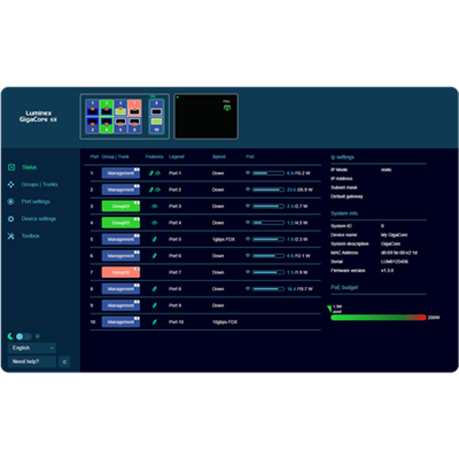 All GigaCore switches can be managed with a single network-wide tool: AraneoAraneo’s online mode shows everything you need to know about the status of your GigaCore network. Data streams and topology are visualized as are the port status of every GigaCore.Monitor your network with confidence and act before the show gets interrupted!In offline mode, Araneo lets you plan the complete network topology and GigaCore settings in advance. Reducing network commissioning time to a mere click of a button.