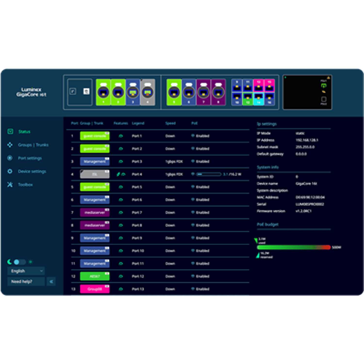 The built-in web UI allows you to adjust the settings in an intuitive way. Assigning Groups (VLANS) to ports, creating trunks or adjusting other port- and PoE settings can be done on the fly and the status page gives you an overview of the complete switch at a glance. The toolbox page allows management of profiles and lets you upgrade firmware easily.