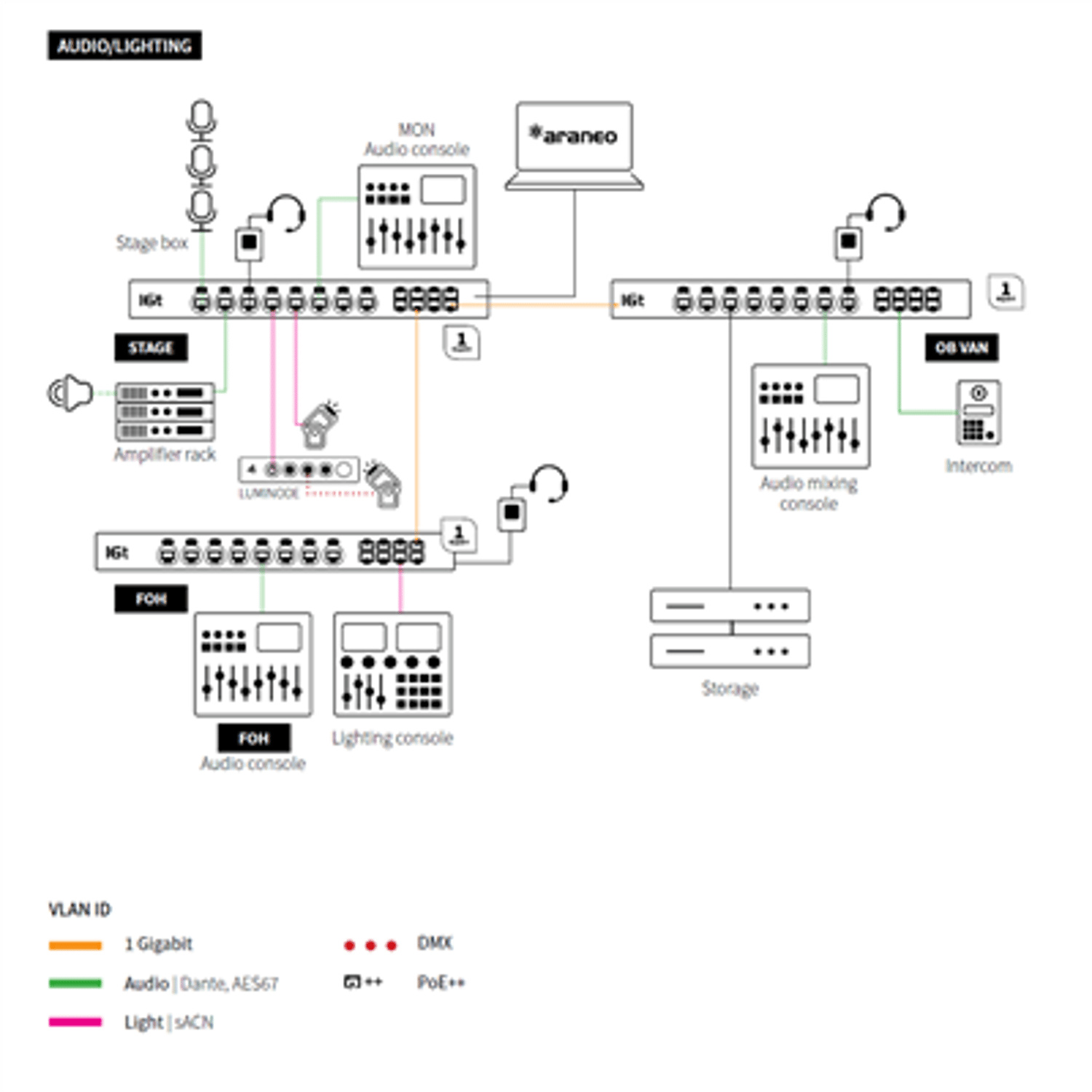 Connectivity Ethernet connectivity: 8 x EtherCon conectors ) (4x front, 4x rear) (1Gbps)8 x RJ 45 connectors (rear) (1Gbps) Fiber connectivity: No Ethernet port speed: 1Gbps Serial: NoPower Power connectivity: 1 x PowerCON True 1 in/out Power input: 100-240VAC, 50-60Hz Power consumption: Maximum 50W - Maximum 1050W (Depending on PoE and PSU configuration) Fuse: NA Backup power input: Yes (PoE models only) Backup PoE power input: Yes PoE: PoE ++ OptionalProtocols Supported protocols: Dante©, RAVENNA/AES67©, Ethersound©, Q-SYS/Q-LAN, sACN, ArtNet, MANet2, HogNet, RTTrPL (BlackTraX), IEEE 802.1p CoS (Class of Service), DiffServ (DSCP), PoE (802.3af) (optional), PoE+ (optional), PoE++ (802.3bt) (optional), IEEE 1588 PTP V2, AVB/MILAN Sound protocol compliance: Yes (low jitter) Ethernet compliance: IEEE 802.2, IEEE 802.3, IEEE 802.3u, IEEE 802.3x Flow Control, IEEE 802.3ab Gigabit Ethernet, IEEE 802.3af PoE(optional), IEEE 802.3at PoE+(optional), IEEE 802.3bt PoE++ 90W(optional), IEEE 802.1p CoS, IEEE 802.1d Spanning Tree, IEEE 802.1w Rapid Spanning Tree, EEE 802.1s Multiple Spanning Tree, IEEE 802.1Q VLAN, IEEE 802.1ab LLDP, IEEE 1588-2008 PtPv2, IEEE 802.1 BA-2011 AVBConfiguration Display and jog: No Configuration: Through the built-in web server, Network wide configuration through Araneo software Status LEDs: Global status LEDs: Device, power, PoE power and mode Port status LEDs: PoE, groups, link/activity and port speed Dark mode available Colored RGB LEDs: YesPhysical Mounting: Rack Enclosure: Robust metal housing Dimensions (W x D x H): 482 x 216,95 x 44 mm (19" x 8.54" x 1,73") Weight: TBC Packaging: TBC Environment: Operating temperature: 0 to +50 °C Storage temperature: -10 to +70 °C Humidity (non condensing): 5 to 95% RH Noise level @1m: TBC BTU: TBD Certificates/Approvals: Pending: cSGSus Mark (UL), CE Mark, UKCA Mark, CB certificate, RoHS Standards: Pending: IEC 62368-1, UL 62368-1, CAN/CSA C22.2 No. 62368-1, EN 62368-1, FCC Part 15 CFR 47, CAN/ICES-003, EN 55032, EN 55024***Check our DOWNLOADS section below for more info.***