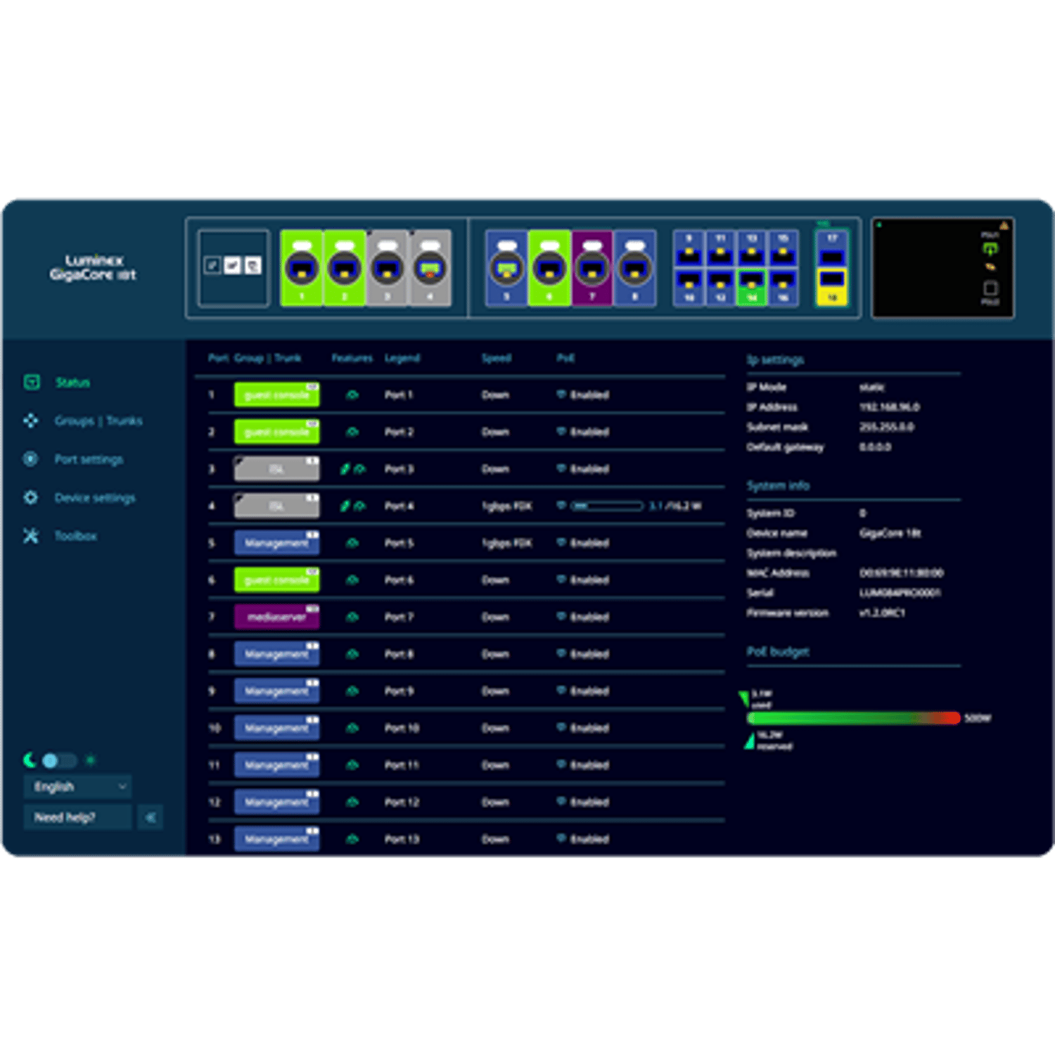 The built-in web UI allows you to adjust the settings in an intuitive way. Assigning Groups (VLANS) to ports, creating trunks or adjusting other port- and PoE settings can be done on the fly and the status page gives you an overview of the complete switch at a glance. The toolbox page allows management of profiles and lets you upgrade firmware easily.