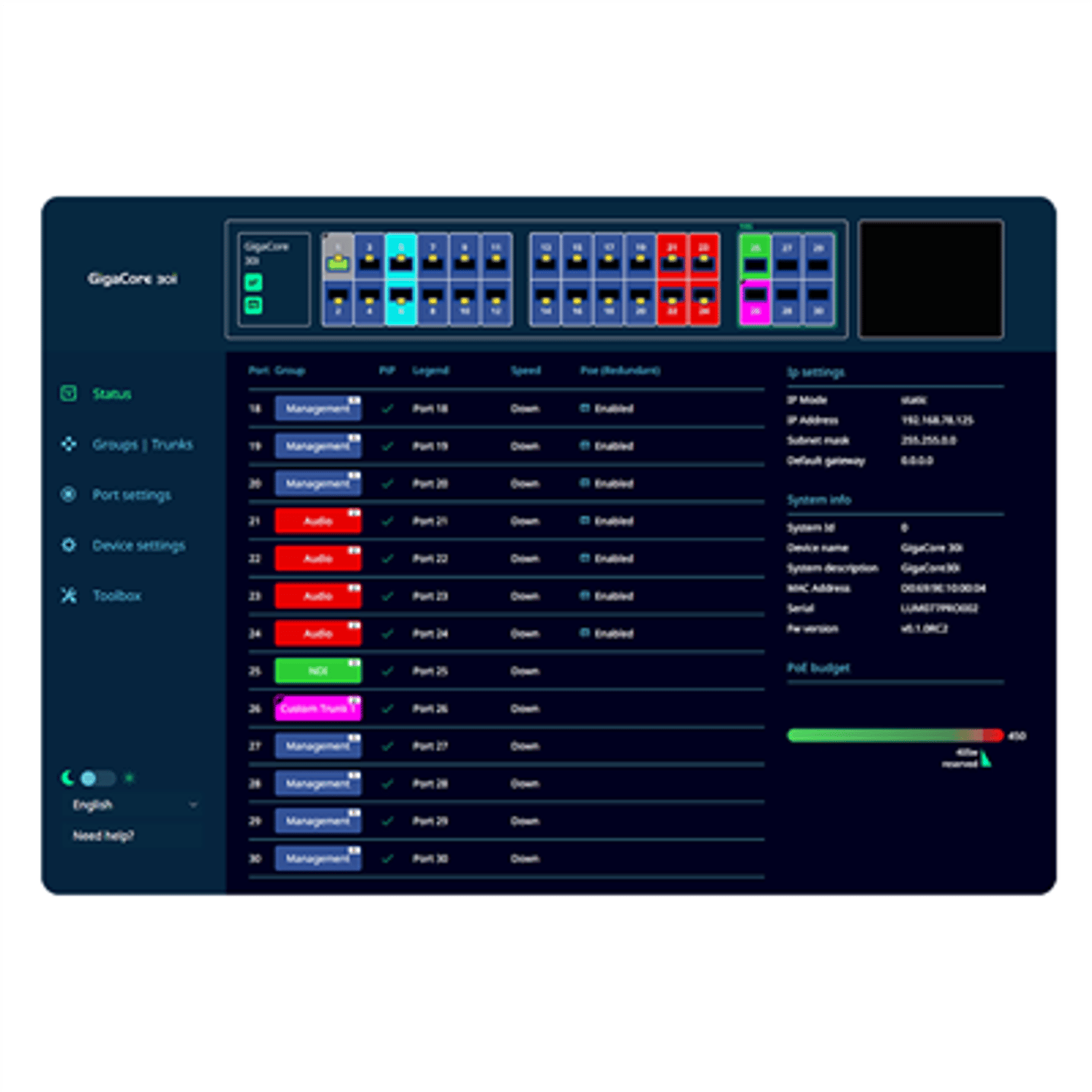 The built-in web UI lets you make adjustments to the settings in an intuitive way. Assigning Groups (VLANS) to ports, creating trunks or adjusting other port- and PoE settings can be done on the fly and the status page gives you an overview of the complete switch at a glance. The toolbox page allows management of profiles and lets you upgrade firmware easily.