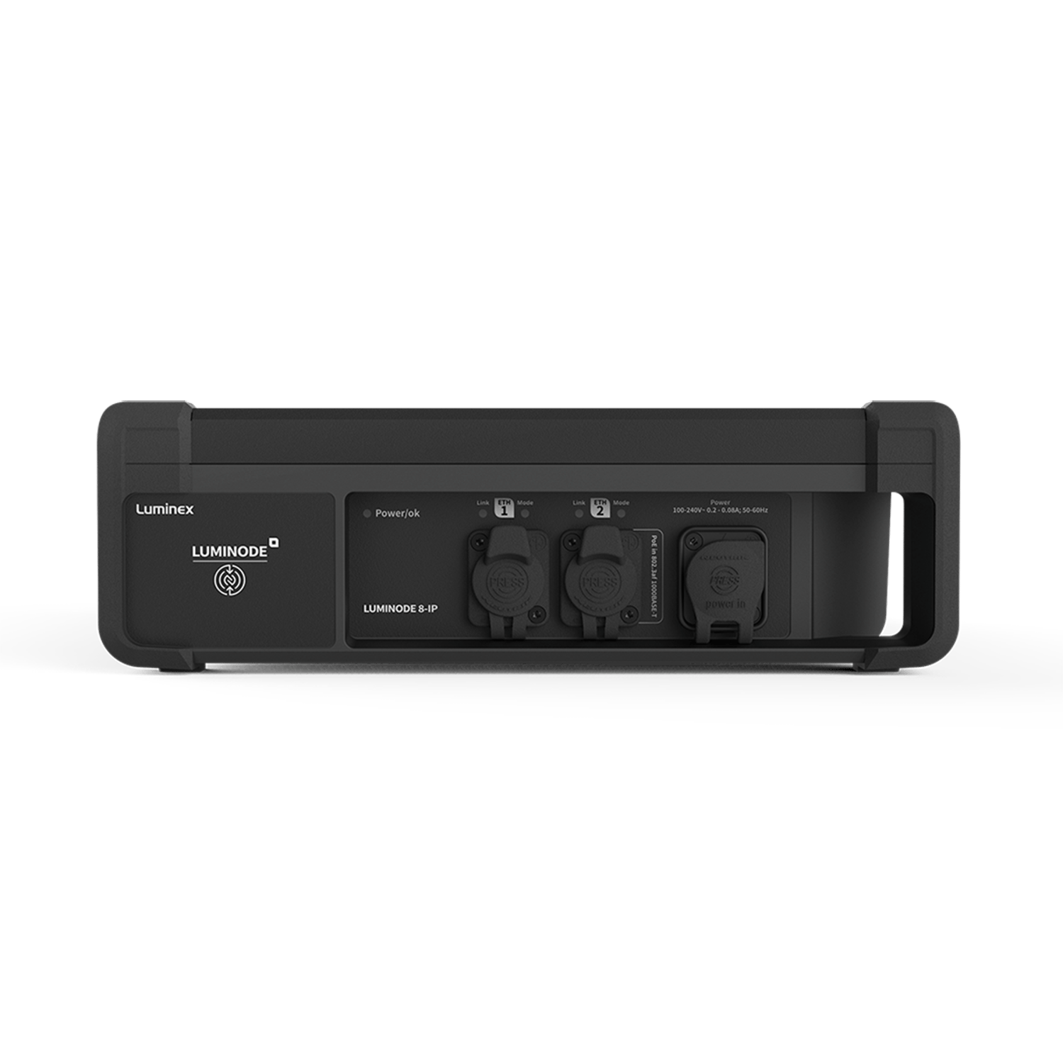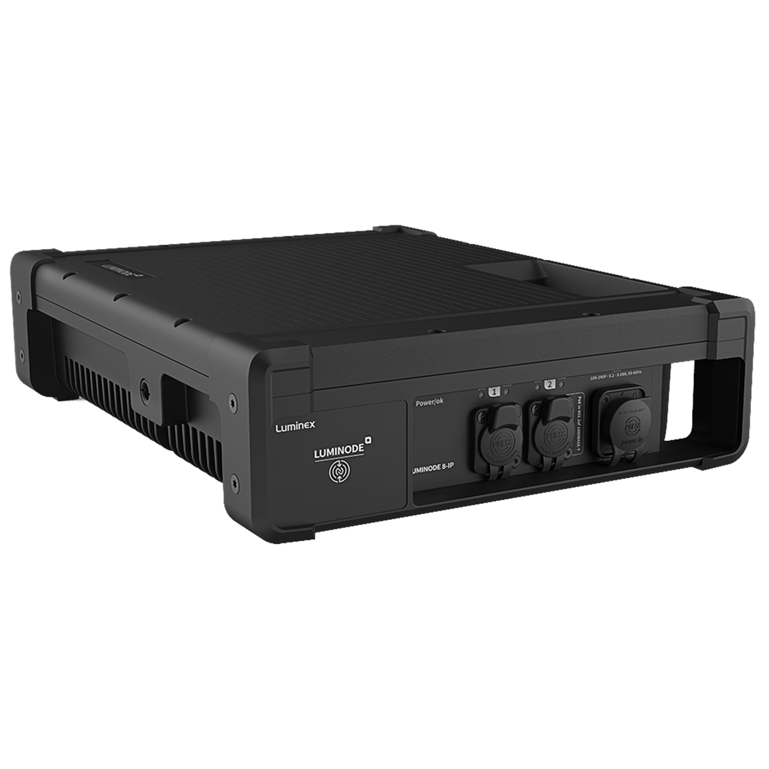 Specifications LumiNode 8-IP DMX/RDM connectivity: 8x 5 pin XLR (female) Rugged IP65Ethernet connectivity: 1x gigaBit shielded IP65 ethercon - PoE-802.3af 1x gigabit shielded IP65 etherconContact closure: NoPower connectivity: 1x IP65 powercon Ethernet (PoE 802.3af class 0) DMX protocols: DMX512 (1986 & 1990) DMX512-A ANSI E1.11 RDM ANSI E1.20-2010DMX port direction: Input or output (configurable)DMX port isolation: Optical and galvanic isolation per portDMX timing: Framerate: 10-40fps Break: 176-352µs Ethernet protocols: Art-Net™ (1-4) sACN ANSI E1.31 RTTrPL (BlackTraX) KiNET v1, v2Ethernet port speed: 10/100/1000MbpsPort sensing: Auto-negociation MDI / MDIXSplit management interface: YesGroups (VLAN) support: Yes Process engines: 16Merging engine: HTP LTP Backup Switch X-Fade CustomSoftpatch: YesMaster/Limit: Proportional LimitTrigger system: YesReRoute: YesProfile manager: YesSnapshot: YesDMX Redundancy: YesMonitoring software: LumiNet MonitorConfiguration: Built in Web server Documented Web API NFC app Display and jog: NoStatus LEDs: Ethernet Port: link/activity LED and Group RGB LED DMX Port: DMX/RDM LED Power input: 100-240VAC (50-60Hz) PoE IEEE 802.3af (Class 0)Power consumption: Maximum 13WPower redundancy: Yes Operating temperature: -20°C to +60°CStorage temperature: -20°C to +70°CHumidity (non condensing): 5 to 95% RH Enclosure: Robust all aluminium alloyMounting: Truss mount M10 inserts (3x), 10x10 VESA mount inserts, Multiple devices stackable.Dimensions (W x D x H): 281 x 358 x 90 mm (11,06" x 14,09" x 3,54")Weight: 7,2kgPackaging: TBD Electromagnetic emissions and immunity: EN55032 class A EN55035 EN61000-3-2 EN61000-3-3 EN61000-4-2 EN61000-4-4 EN61000-4-5 EN61000-4-6 EN61000-4-8 EN61000-4-11 FCC Part 15 CFR 47 class A ICES-003 Issue 6Safety: IEC 62368-1 EN 62368-1 UL 62368-1 CAN/CSA-C22.2 No. 62368-1 CECertificates: cSGSus Mark CE UKCA CB certificate IP65Green: RoHS REACH Read moreLumiNode 8-IP is designed with an IP65 rated, all metal, robust enclosure,withstanding extreme temperature conditions, making it an ideal solution for outdoor AV installs and live performances. Equipped with 2x 1Gb IP65 ethercon ports and 8 DMX/RDM ports with IP65 5-pin connectors, LumiNode 8-IP offers flexibility in a weather proof package. Each port is fully optically and galvanically isolated and can be configured as an in- or output. All relevant industry standard protocols such as Art-Net, sACN, KiNET, RTTrPL (Blacktrax) are supported and can be processed and converted in no less than 12 onboard process engines supporting HTP, LTP, Crossfade, Backup, Switch and Custom merging modes with soft patch functionality.