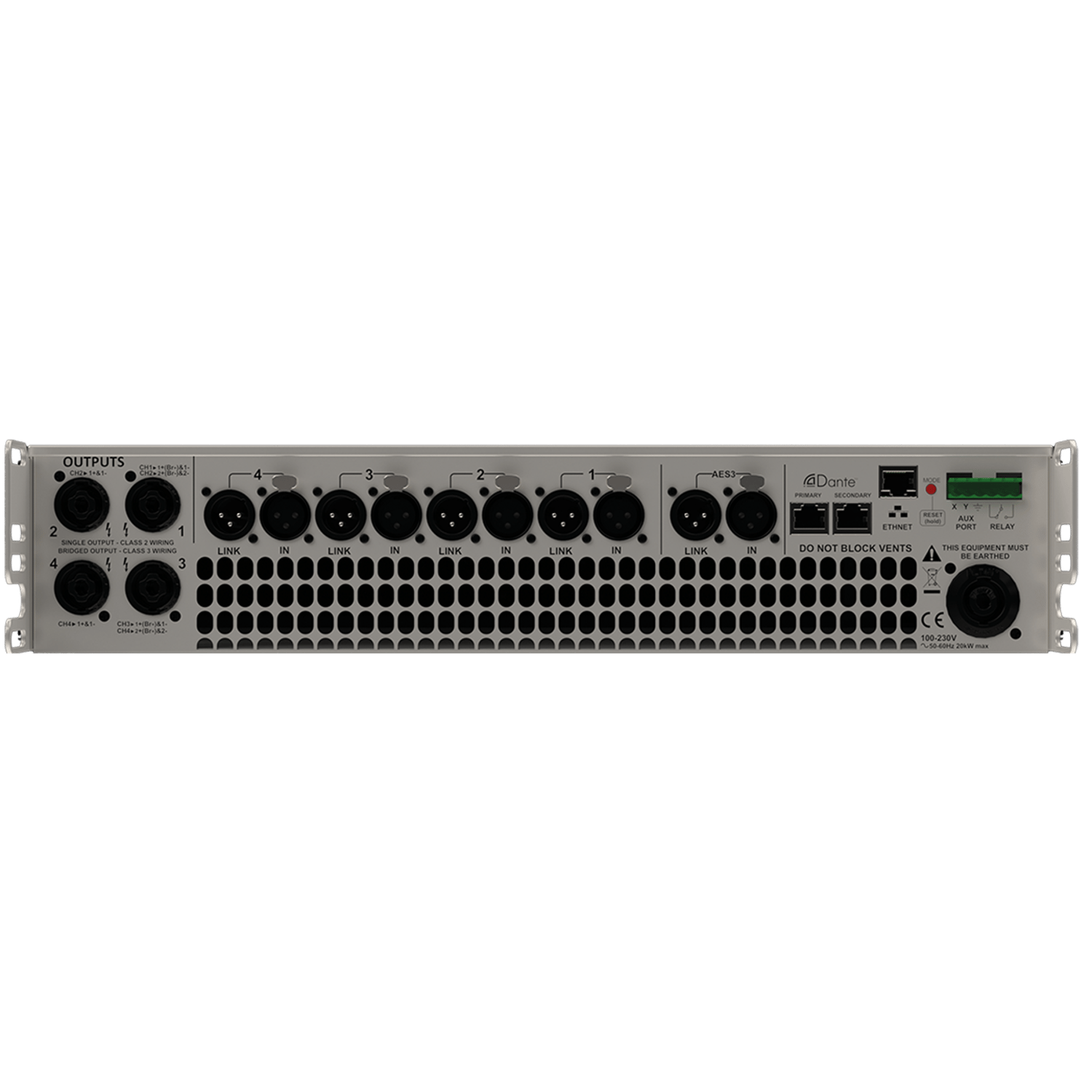 5000W, 100V line Digital Signal Processing 96kHz/48kHz DSP on all inputs and outputs Cooling Dual vari-speed fans, front-to-back airflow Maximum Ambient Temperature 40°C (104°F) AUDIO INPUTS/OUTPUTS Analogue In/Link (4 Channels) 4 x female, 4 x male Neutrik™ XLR Analogue Input Impedance 20kΩ balanced to ground Maximum Analogue Input Level +20dBu AES3 In/Link (2 Channels) 1 x female, 1 x male Neutrik™ XLR, balanced Dante™ (4 Channels) (AES67 Compatible) 2 x shielded RJ45, primary and secondary Amplifier Outputs 4 x Neutrik Speakon™ NL4 AUDIO PERFORMANCE Dynamic Range >113dBA, analogue input