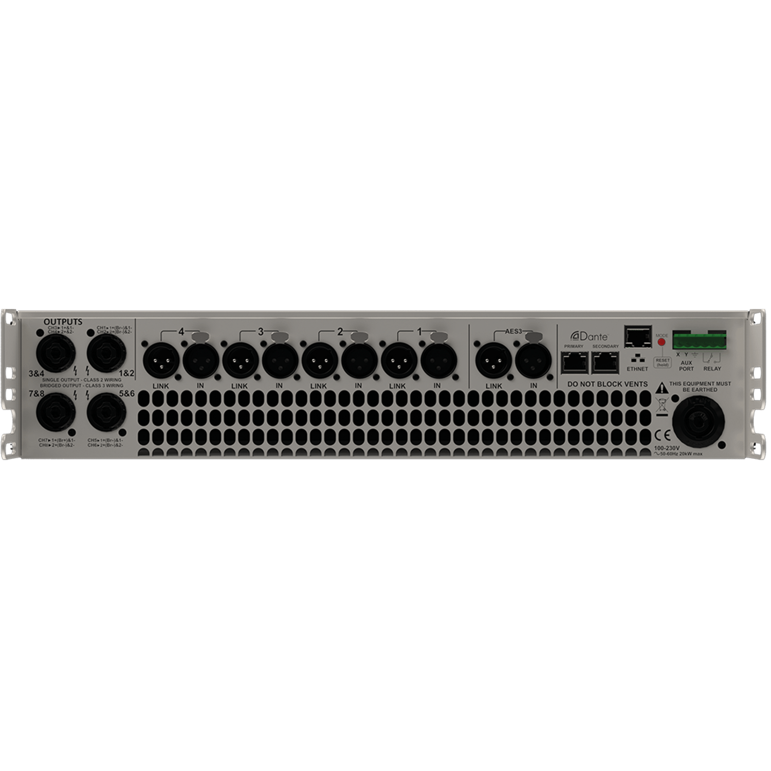 Ethernet is used for system remote control and monitoring via Martin Audio’s VU-NET software application, while a user friendly front panel interface allows full local control of all features. Dante digital audio network inputs are also provided for digital audio distribution and control.
