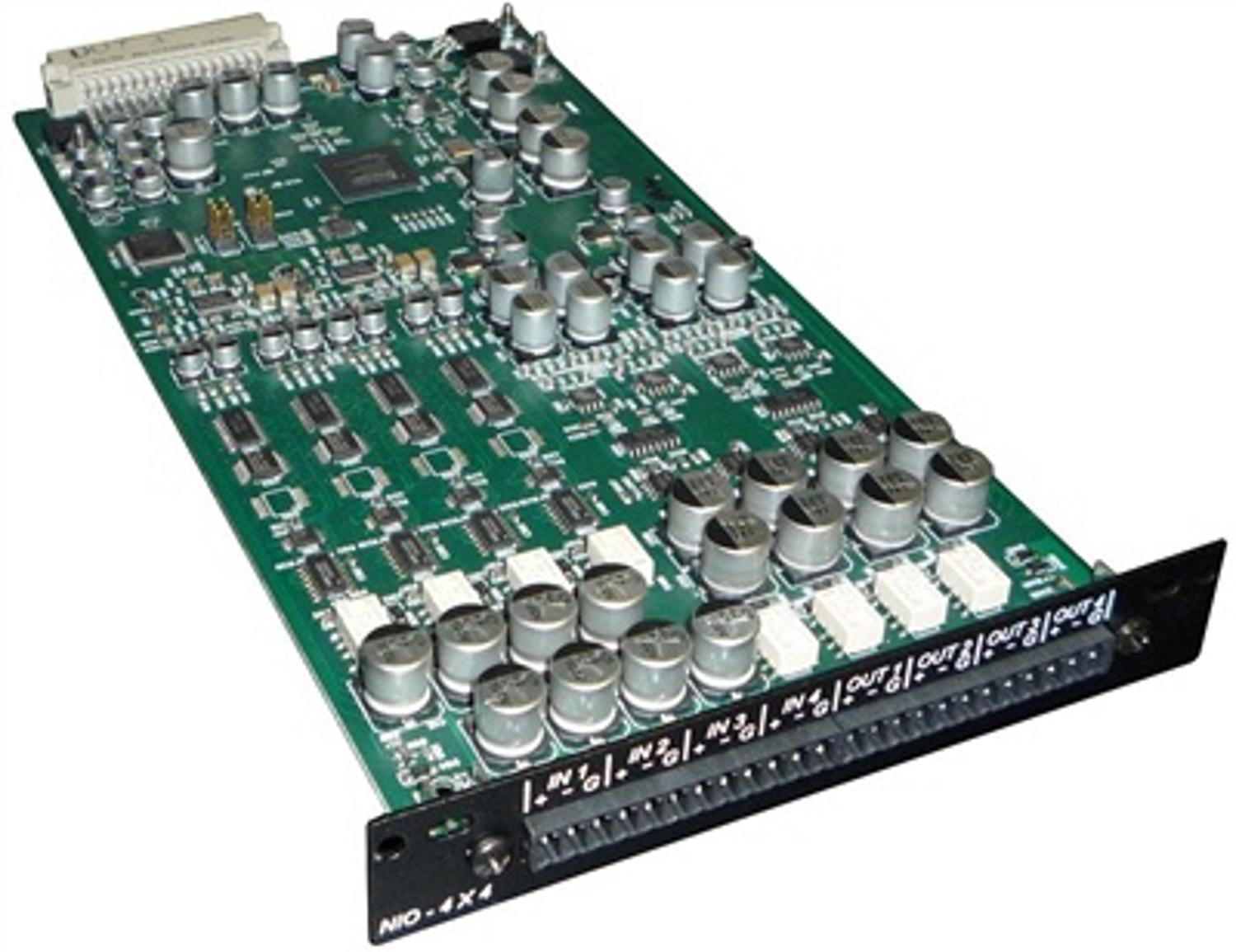 The NIO™-4x4 Mic/Line Input/Output Card is a 4-channel mic/line level input and 4-channel line level output device for use in NION® DSP frames. Modular analog audio input/output card and analog to digital and digital to analog converter for the NION Series of digital audio processing products. Depending on the NION model up to 4 NIO-4x4 cards may be loaded in a NION DSP. Includes 4 balanced mic or line level analog inputs terminated on mini Euro connector header Includes 4 line-level analog outputs terminated on mini Euro connector header Includes 8 Euro connectors blocks Supports NWare™ control of analog functionsRead more