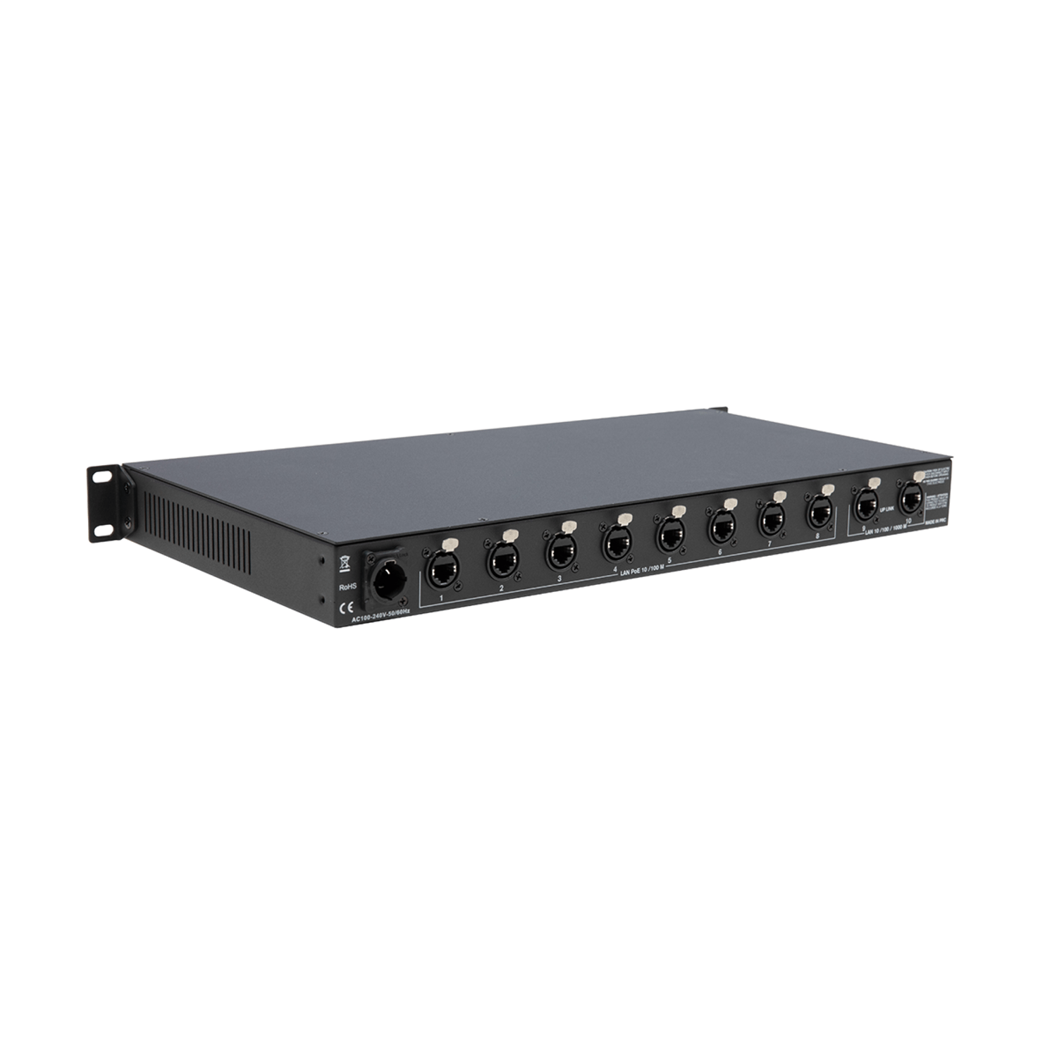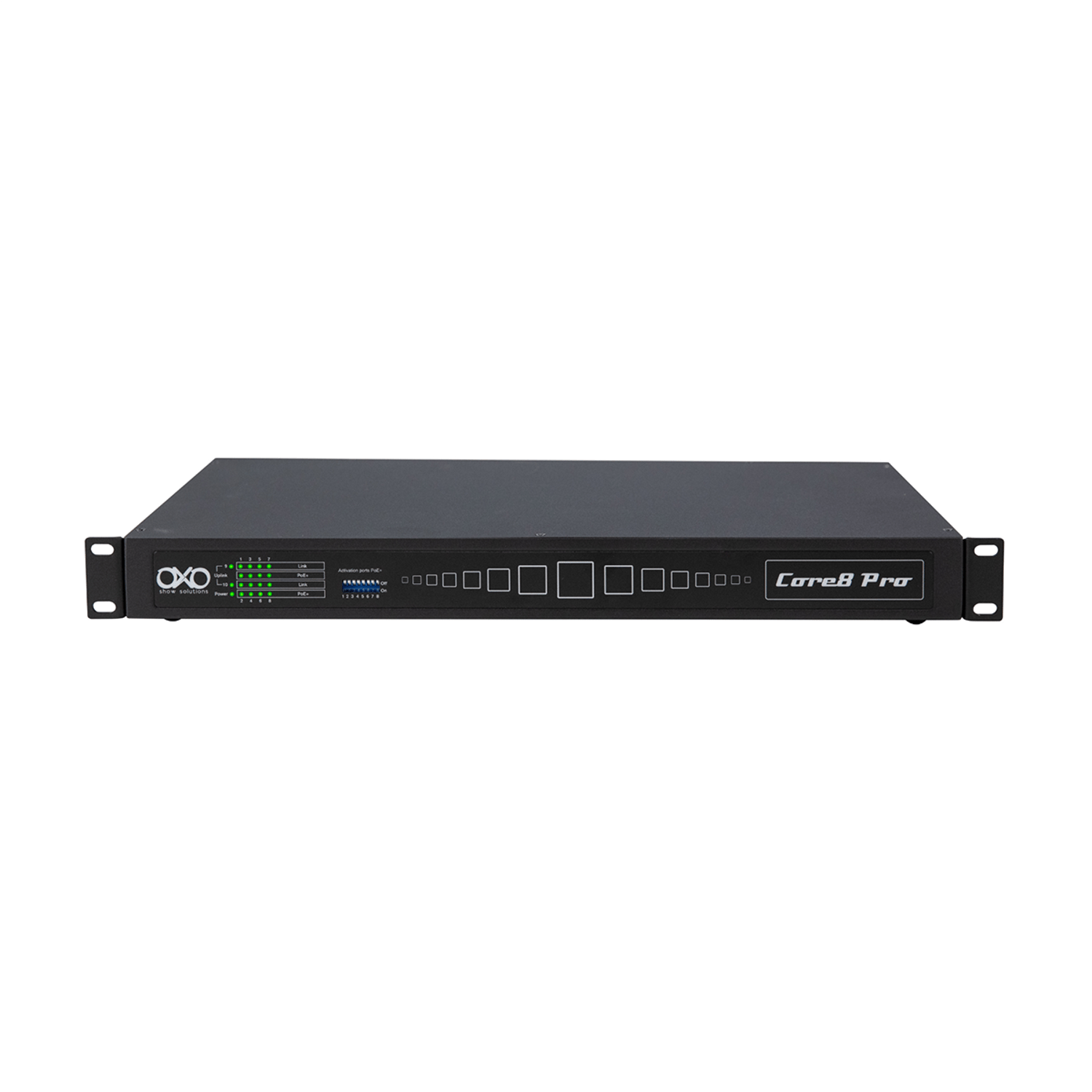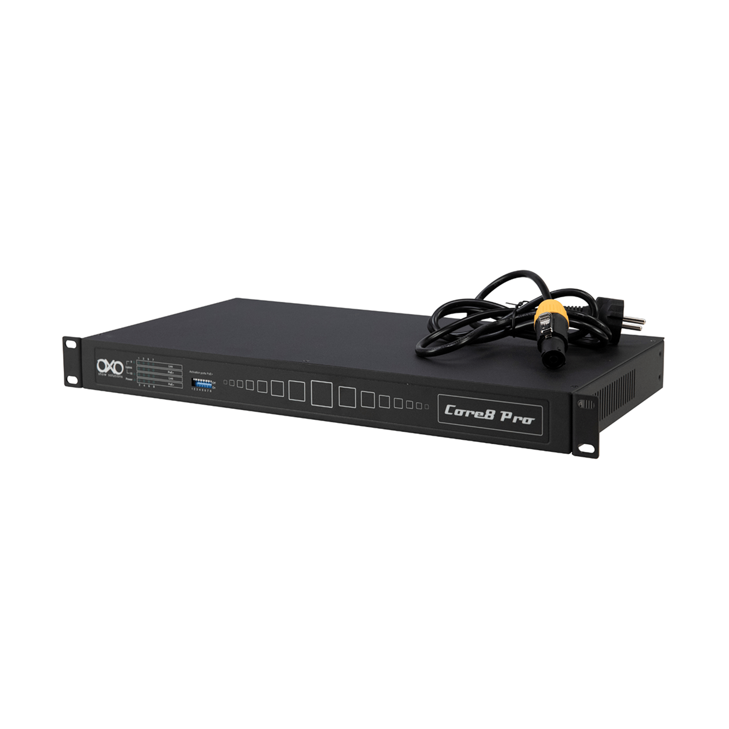The Core8 Pro is an 8-port Mid-Span PoE+ switch, unmanaged, in a 19" rack-mountable format. Equipped with 2 inputs and 8 outputs on etherCON ports, the PoE power of each output can be activated independently using dip switches.