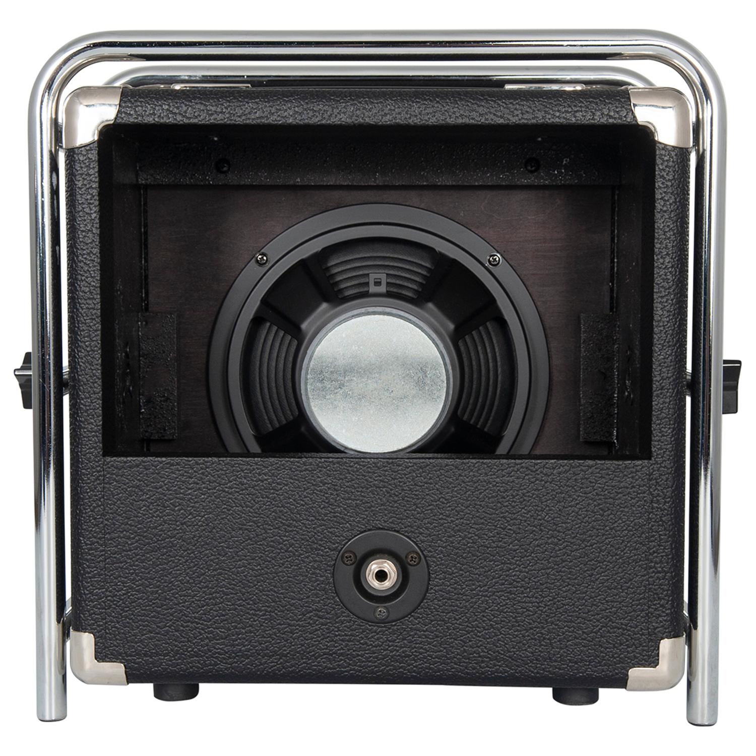 The Peavey DECADE TOO Extension Cabinet builds on this legacy, offering enhanced projection and sonic flexibility. Equipped with an 8” speaker and housed in a rugged chrome stand, the cabinet provides both a visual statement and real-world portability. Its tilt-swivel design allows for adjustable directional clarity and monitoring, whether you're in the studio or on stage. The extension cabinet can be positioned separately to improve room dispersion or stacked neatly beneath the DECADE TOO combo for a commanding wall of sound. When nested directly beneath the combo, the amp sits securely on top of the rack, benefiting from superior floor coupling without compromising the “floating” aesthetic of the cabinet. This configuration doesn’t just look iconic—it delivers practical sonic advantages.