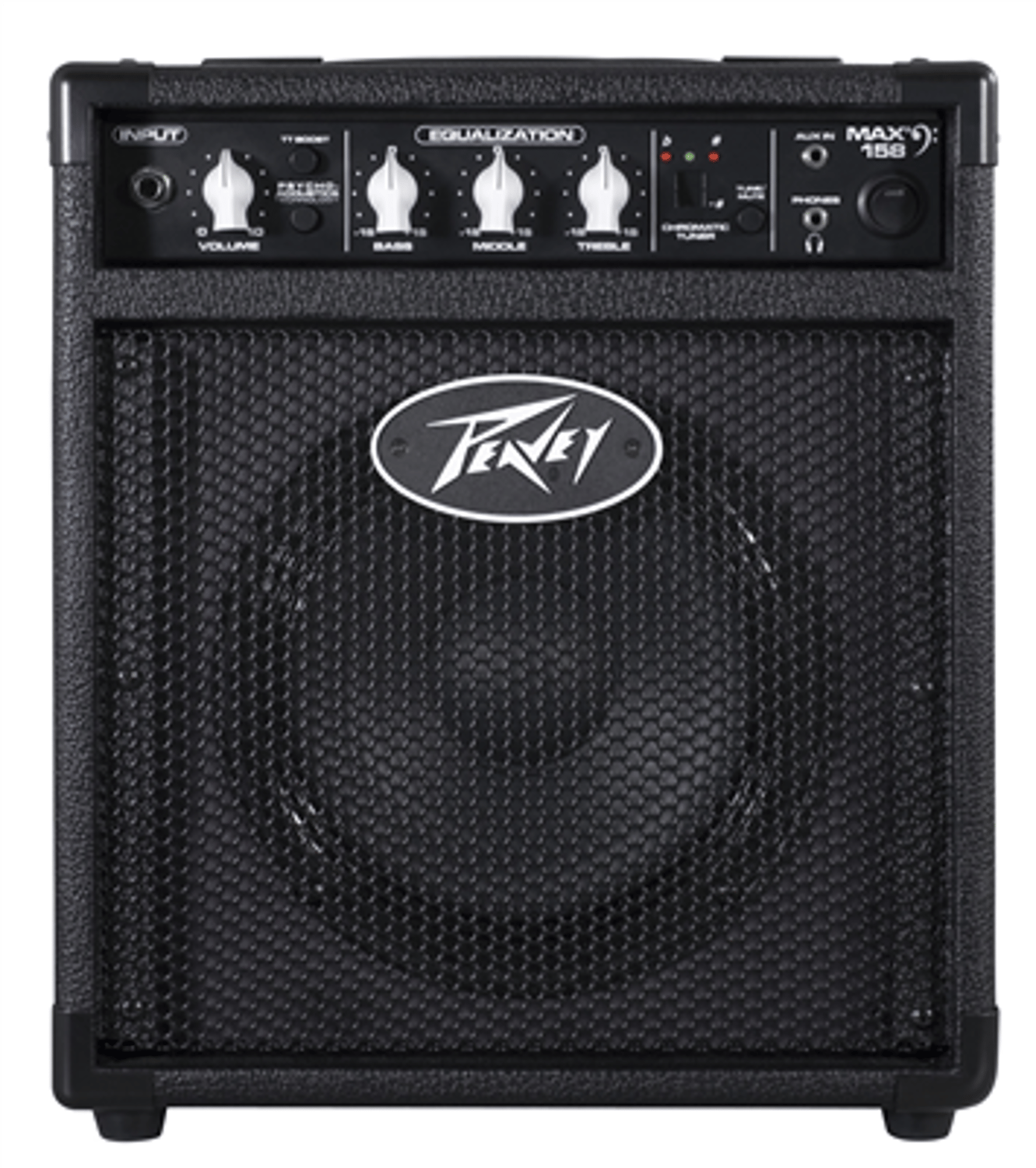 The Max 158 bass combo amp is a 20 watt 1x8" bass practice amp loaded with features, including 1/4" input and Volume with Transtube distortion boost and psyco-acoustic low end enhancement, a 3-band EQ, chromatic tuner and 1/8" jacks for phones output and auxiliary input. The Max 158 also includes Peavey-exclusive DDT speaker protection.