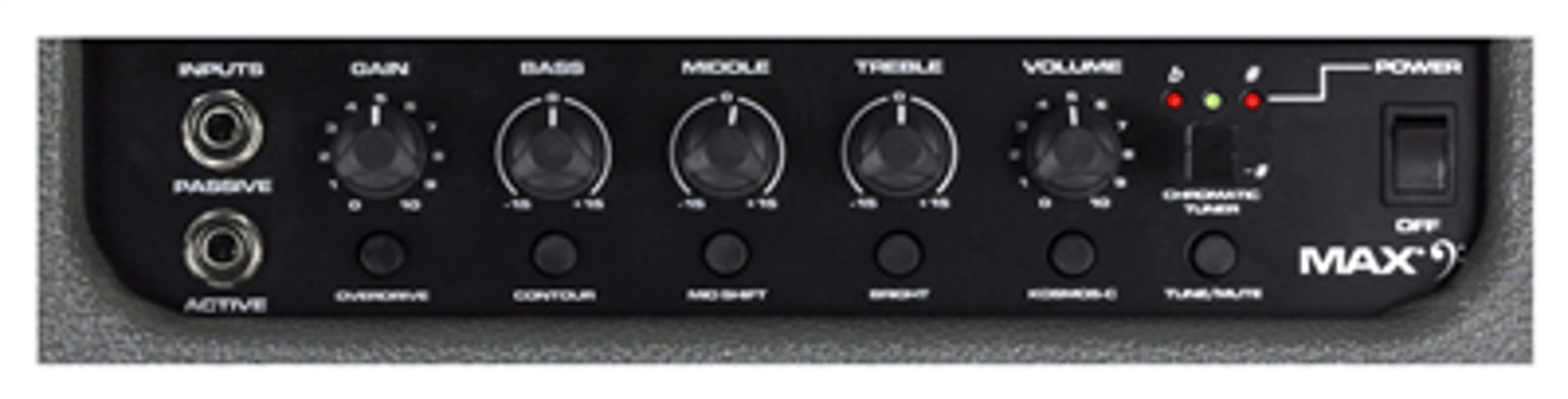 The MAX also features a built-in chromatic tuner with mute, a tuned and ported enclosure, 1/8" headphone output and 1/8" auxiliary input. The amp also includes an XLR direct output with ground lift, as well as a built-in tweeter.