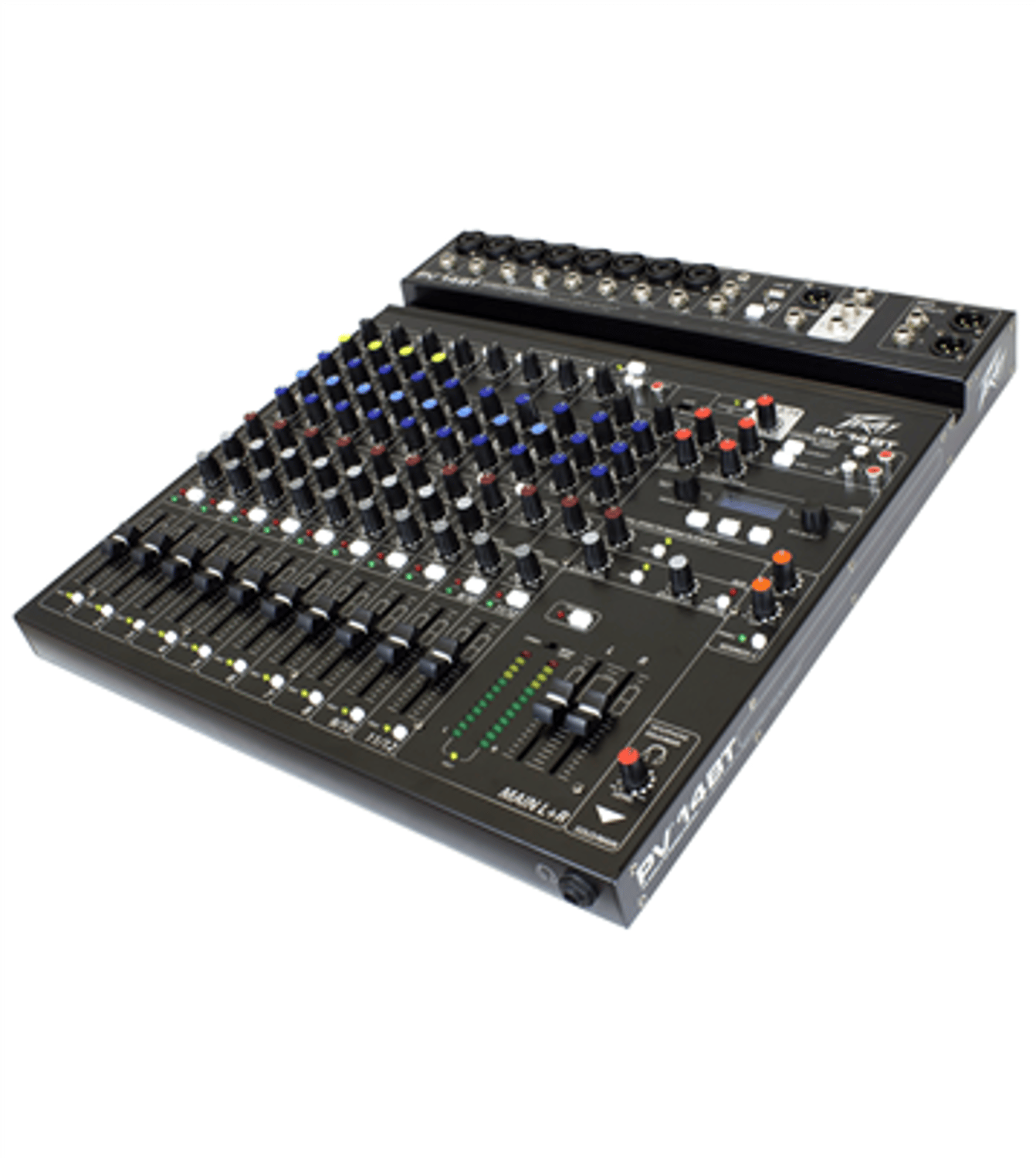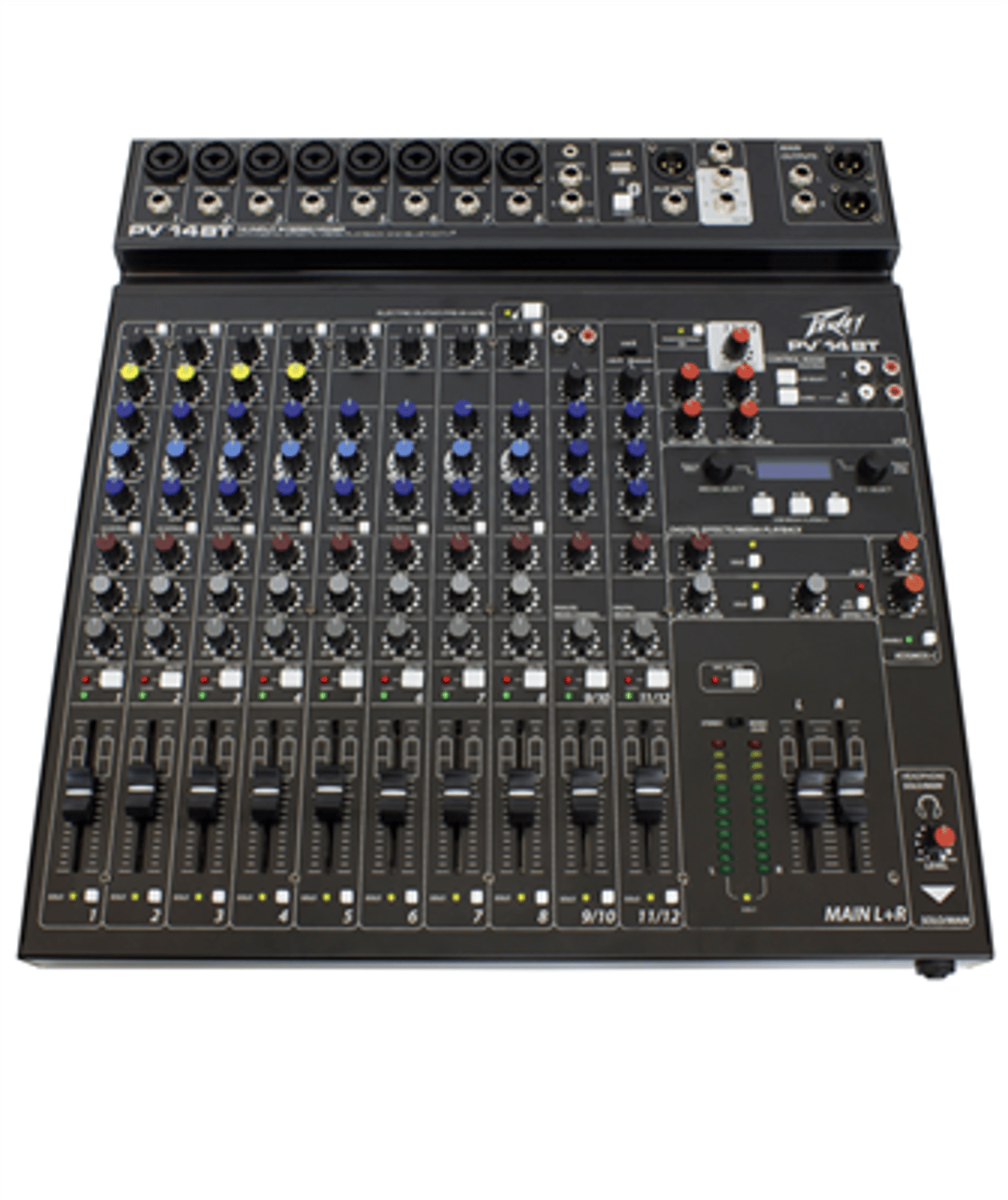 The PV 14 BT includes 8 channels of reference quality mic preamps, 8 direct outputs for recording, a stereo channel, media channel with Bluetooth® wireless input, high quality digital effects with LCD display, streaming USB out, MP3 playback via USB A input, Peavey's exclusive Kosmos® audio enhancement, 48-volt phantom power, dual selectable control room outputs, 4 channels of compression, one channel of on board selectable guitar preamp, 3-band EQ per channel with bypass, channel mute buttons, aux send, signal clip indicators, and a stereo master LED meter bridge. This amazingly versatile mixer is at home both in the studio as well as live applications.