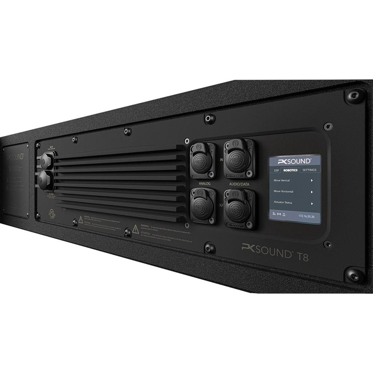 T8 is the compact member of the industry’s first robotically controlled line source family. Featuring PK Sound’s patented multi-axis robotics, T8’s stunning output – with peak SPLs reaching 143.5 dB – is precisely controlled down to 400 Hz in both the vertical and horizontal planes, offering system operators maximum flexibility in making coverage adjustments after the array is flown.