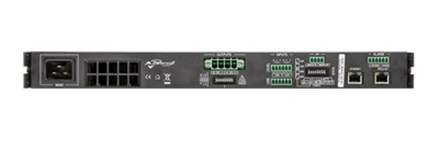 Fixed frequency switchmode output stage for high grade sound accuracy Compact 1 RU for reduced rack cost and space Light weight - for easier racking and shipping: 7 kg (15.4 lbs) Standard Phoenix connectors: analog and digital input, audio outputs, alarms and GPIO Remotely dimmable inputs per channelLoudspeaker system configuration