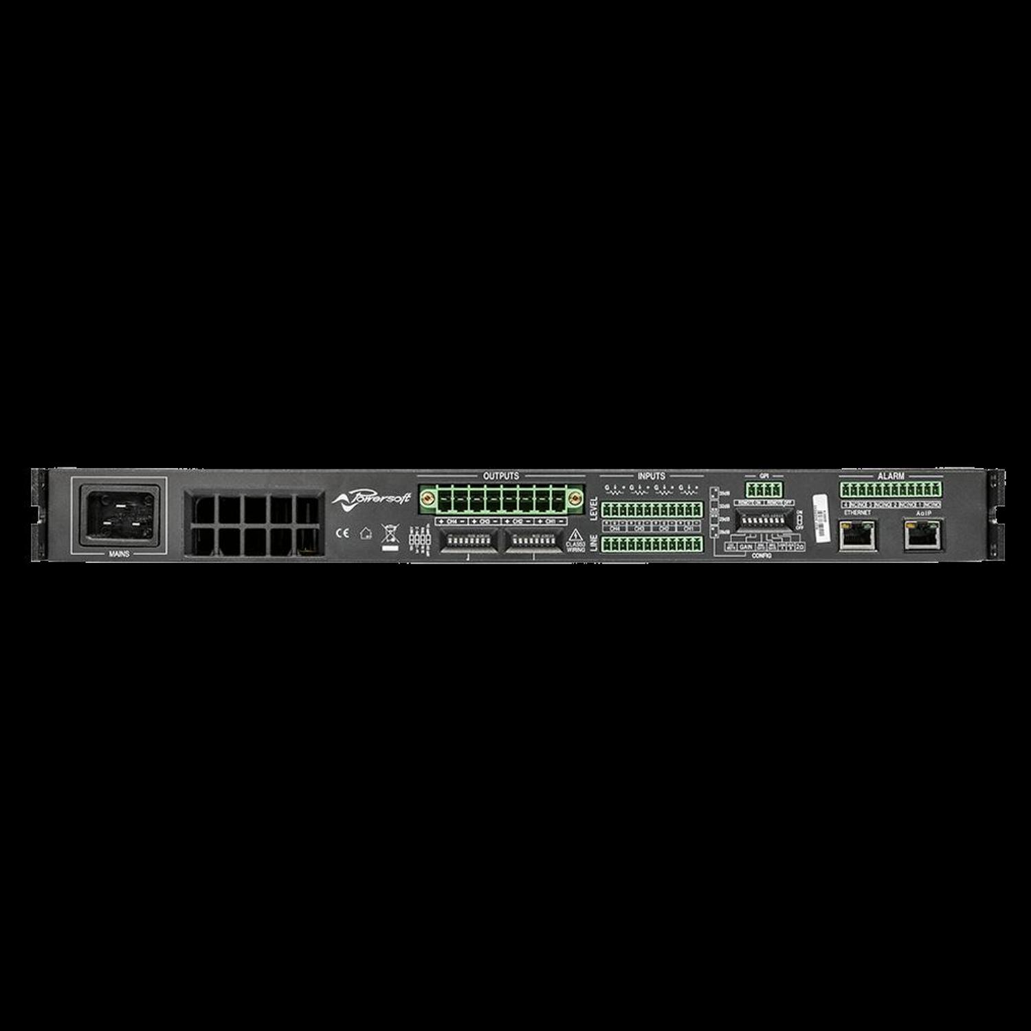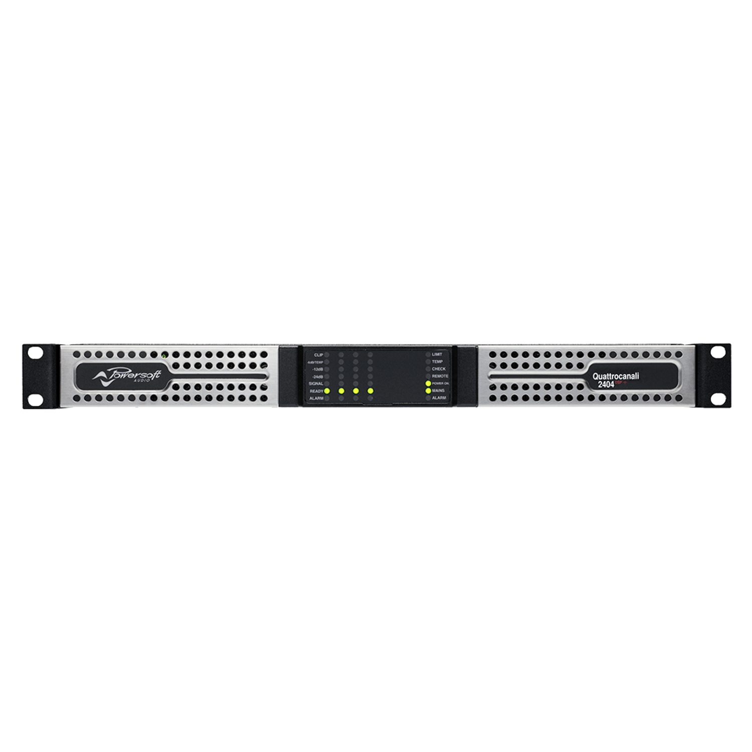 Quattrocanali 2404 DSP+ offers the traditionally amazing sound quality and reliability of all Powersoft products.The patented SRM (Smart Rails Management) technology allows to maximize the efficiency of the system and drastically reduces power consumption in any load and usage condition. Quattrocanali features the lowest thermal dissipation in the industry, reducing the need for external cooling devices.Quattrocanali is designed to operate with Lo-Z (from 2 O) and 70V/100V distributed lines or any mix of the two.DSP+ versions of the Quattrocanali grant in-depth control and monitoring via Armonìa, tailoring the sound and managing the system can be done in a remote, decentralized location.DSP+ versions extend signal routing capabilities with the integration of AES67 digital audio networking architecture.This Amplifier Platform can also be trusted in mission-critical applications, such as fire alarm systems, thanks to the cleverly engineered power supply that allows reliable operation even when connected to a UPS.MyPowersoft services are available for this product.