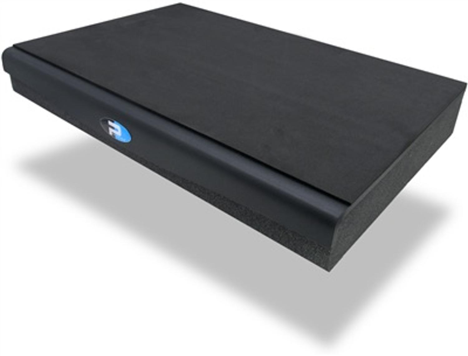 components: a high-density urethane foam base to isolate the speaker from the shelf, monitor-bridge or stand; a heavy ¼” laser-cut steel plate; and a thin neoprene top surface. The foam effectively decouples the loudspeaker to eliminate vibration-borne resonance that invariably introduces phase anomalies, while the steel plate introduces significant mass to the structure, stabilizing the speaker. The no-slip surface coats the top to ensure the monitor stays firmly in place.