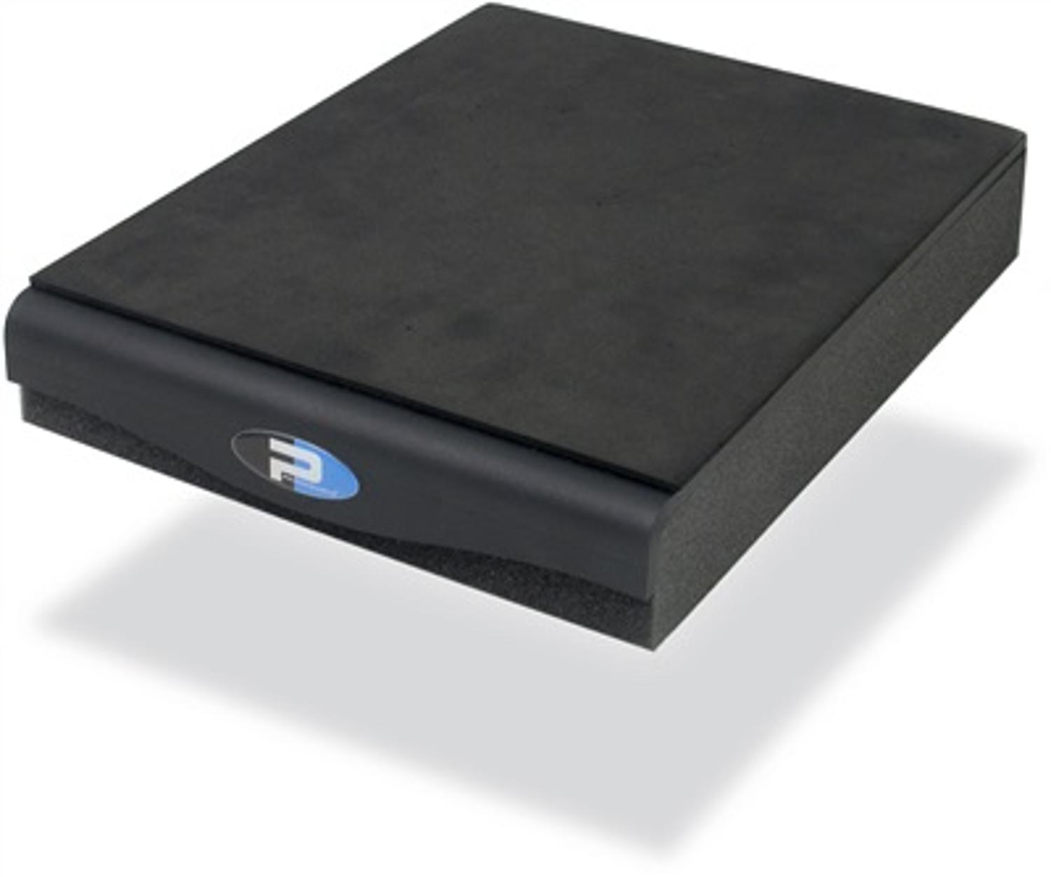 components: a high-density urethane foam base to isolate the speaker from the shelf, monitor-bridge or stand; a heavy ¼” laser-cut steel plate; and a thin neoprene top surface. The foam effectively decouples the loudspeaker to eliminate vibration-borne resonance that invariably introduces phase anomalies, while the steel plate introduces significant mass to the structure, stabilizing the speaker. The no-slip surface coats the top to ensure the monitor stays firmly in place.