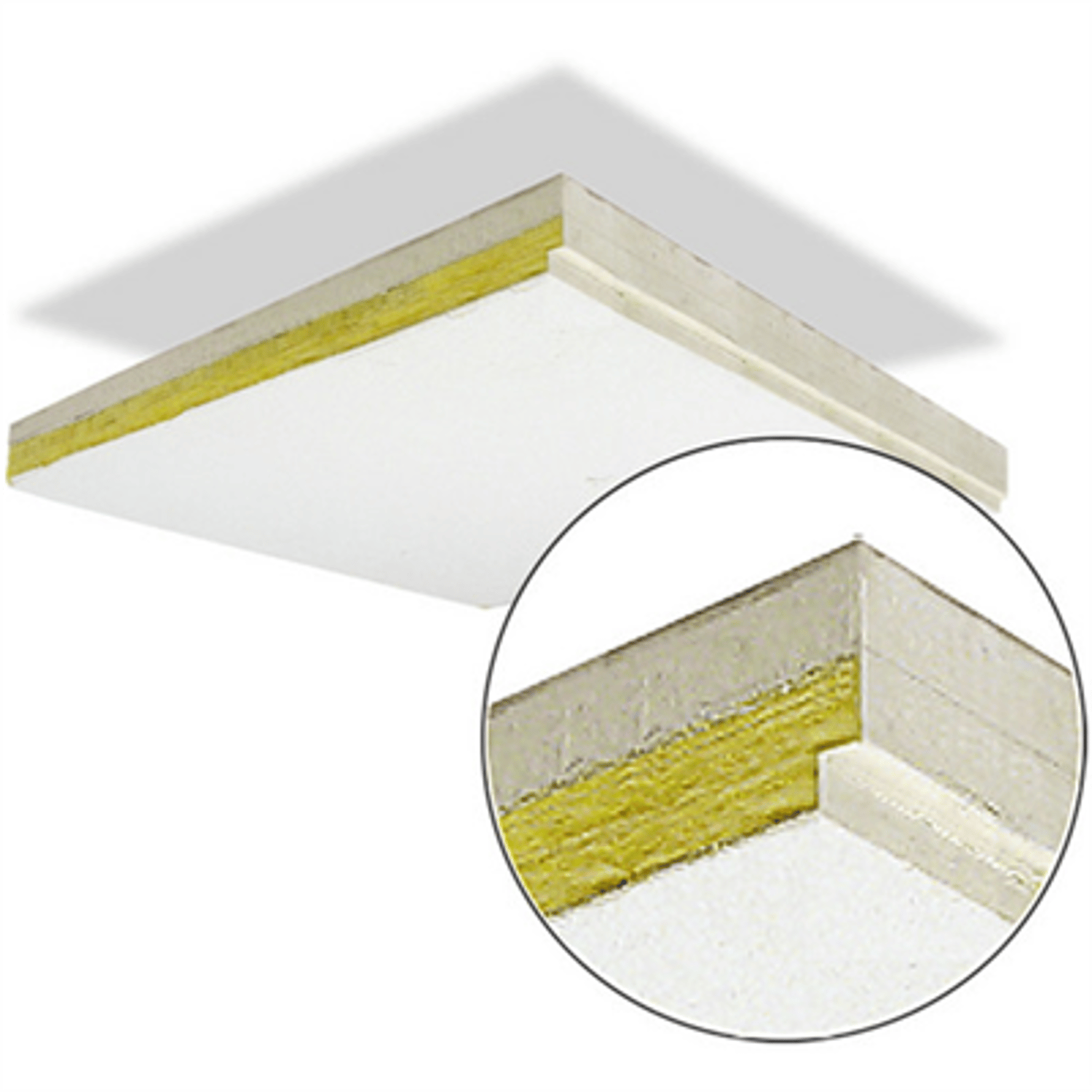The design begins with a pure white finish on top of an acoustically transparent micromesh tissue that fully encapsulates the panel. This is bonded to a ¾” (20mm) layer of 6lb per cubic foot (96 kg/m³) high-density glass wool. Sound waves pass through the tissue into the wool causing the minute glass fibers to vibrate, absorbing sound energy. The acoustic panel is then laminated to a ½” (13mm) layer of heavy gypsum board. This adds the extra ‘sound-blocking’ mass that stops from sound traveling between adjacent rooms through the air space ‘plenum’ above the panels.