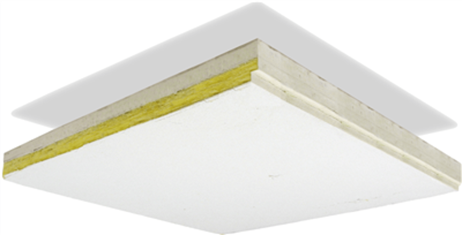 The design begins with a pure white finish on top of an acoustically transparent micromesh tissue that fully encapsulates the panel. This is bonded to a ¾" (20mm) layer of 6lb3 high-density glass wool. Sound waves pass through the tissue into the wool causing the minute glass fibers to vibrate, absorbing sound energy. The acoustic panel is then laminated to a ½” (13mm) layer of heavy gypsum board. This adds the extra ‘sound-blocking’ mass that stops from sound traveling between adjacent rooms through the air space ‘plenum’ above the panels.
