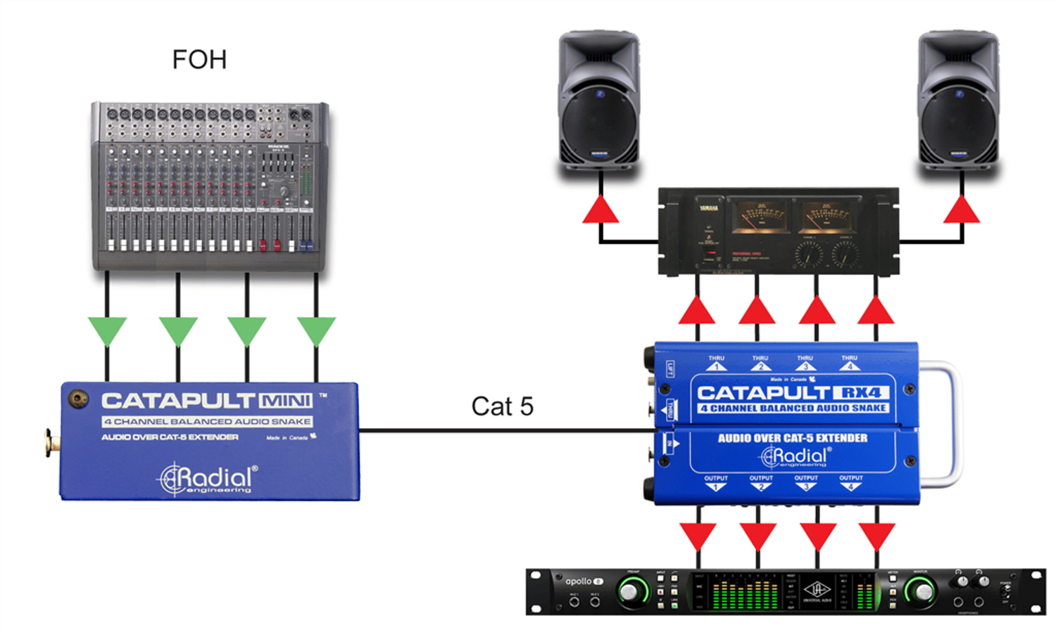 The Catapult Mini RX and TX act like a typical four-channel analog audio snake; they allow you to send mic or line-level signals from one location to another without signal loss, noise, or interference, and without any digital audio conversion needed. What makes the Catapult system unique is that it utilizes Cat 5 Ethernet cable, which is widely available, lightweight, and economical. Simply connect a shielded Cat 5 cable between any two Catapult modules and they will use the analog conductors in the cable to deliver four balanced audio lines to any destination.