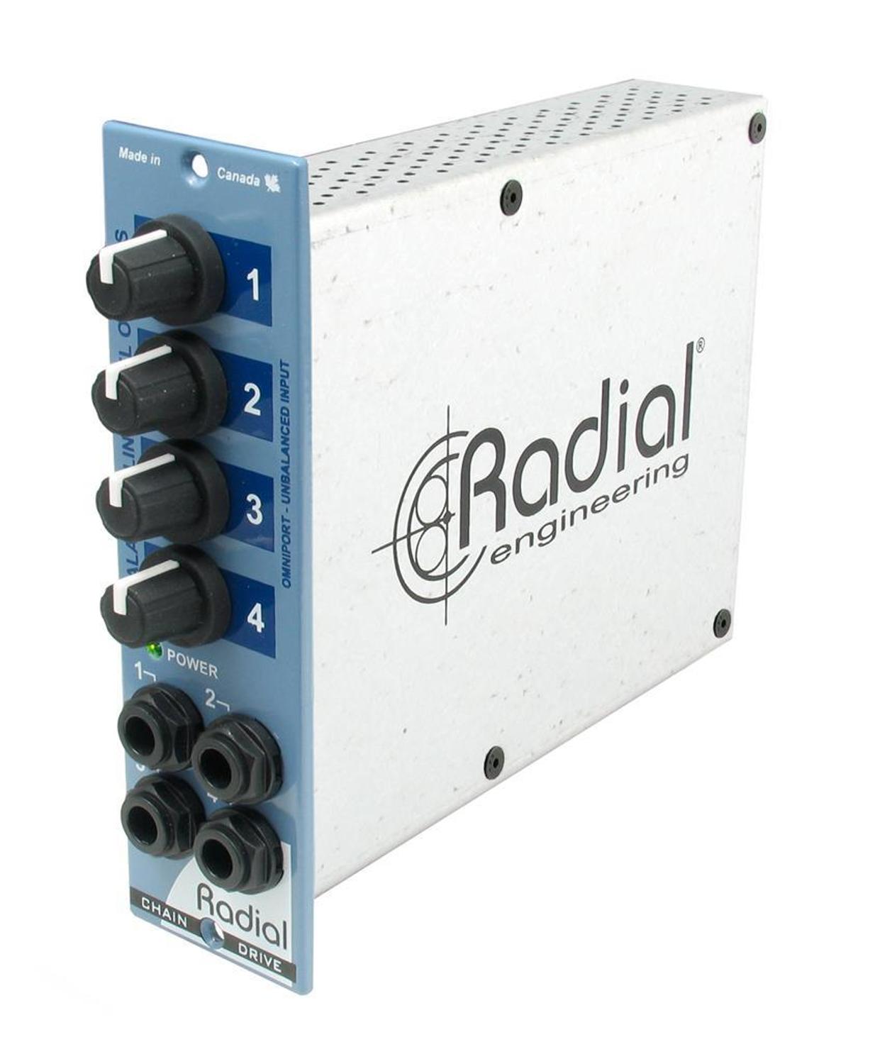 The design is simple and easy to use. One connects to the module via the power rack's rear panel XLR input which then feeds the four corresponding ¼" TRS outputs on the front panel. The unique circuit design enables both balanced and unbalanced signals to be used while also accommodating unbalanced stereo sources. Those with a Radial Workhorse may connect to the ChainDrive via the XLR, ¼" TRS input or D-Sub. Designated as an unbalanced input, the ChainDrive's Omniport input automatically converts the unbalanced signal to a balanced line so that it can then feed other 500 series modules.