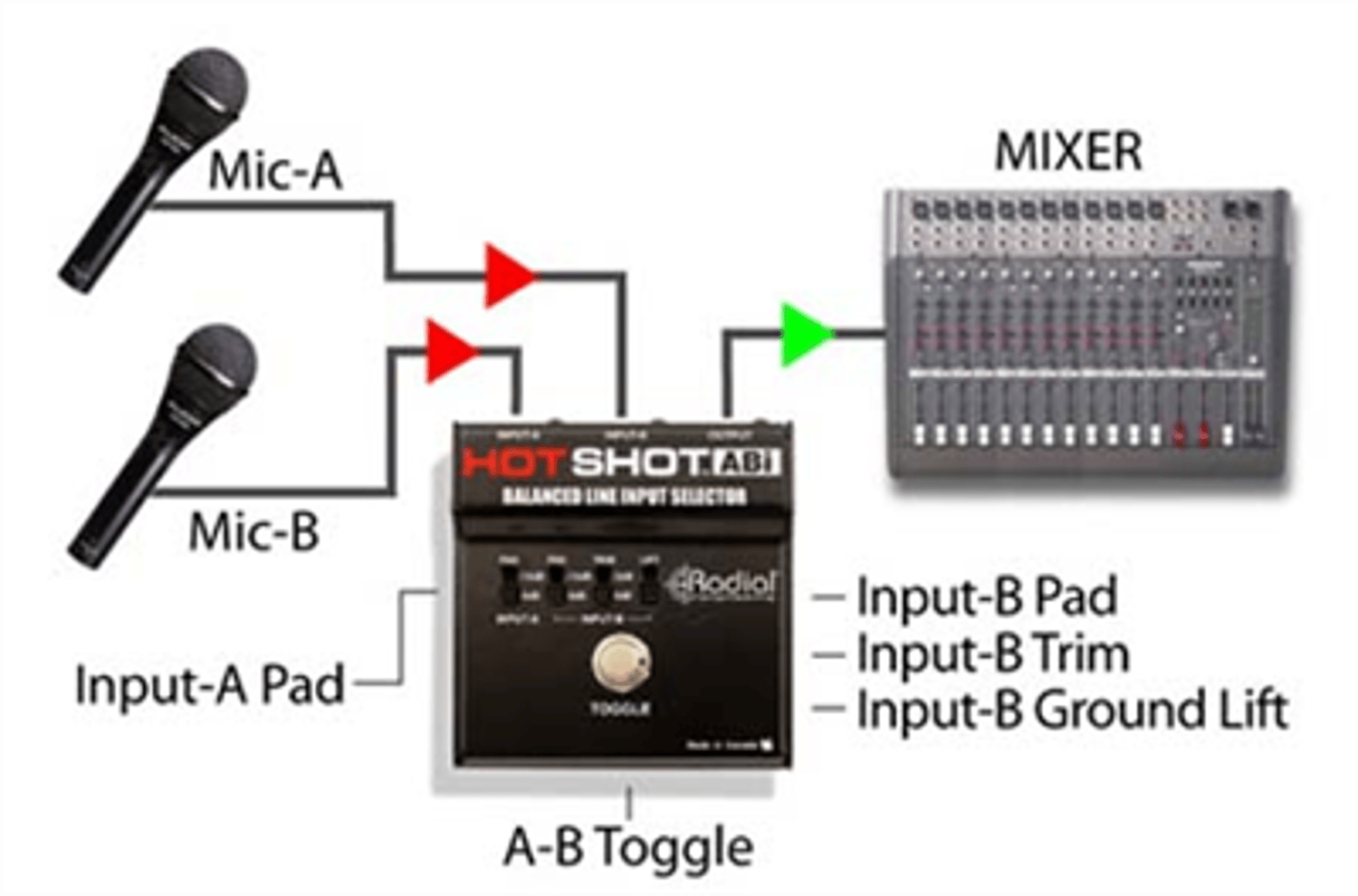 This makes the HotShot ABi ideal for applications such as switching between two dynamic microphones on a stage to save valuable input channels on your mixer. The latching switch also opens the door for other useful operations including using the ABi as a mute to turn off a microphone, to select between two wireless receivers for live sound system backup or to select between two microphones during community hall assembly where it provides the moderator with remote control over two audience microphones. To make switching as seamless as possible, separate level reducing pads on each allow louder sources to be attenuated so that the two sources can be better balanced. A trim switch on input-B further decreases the sensitivity by 6dB for fine adjustments.