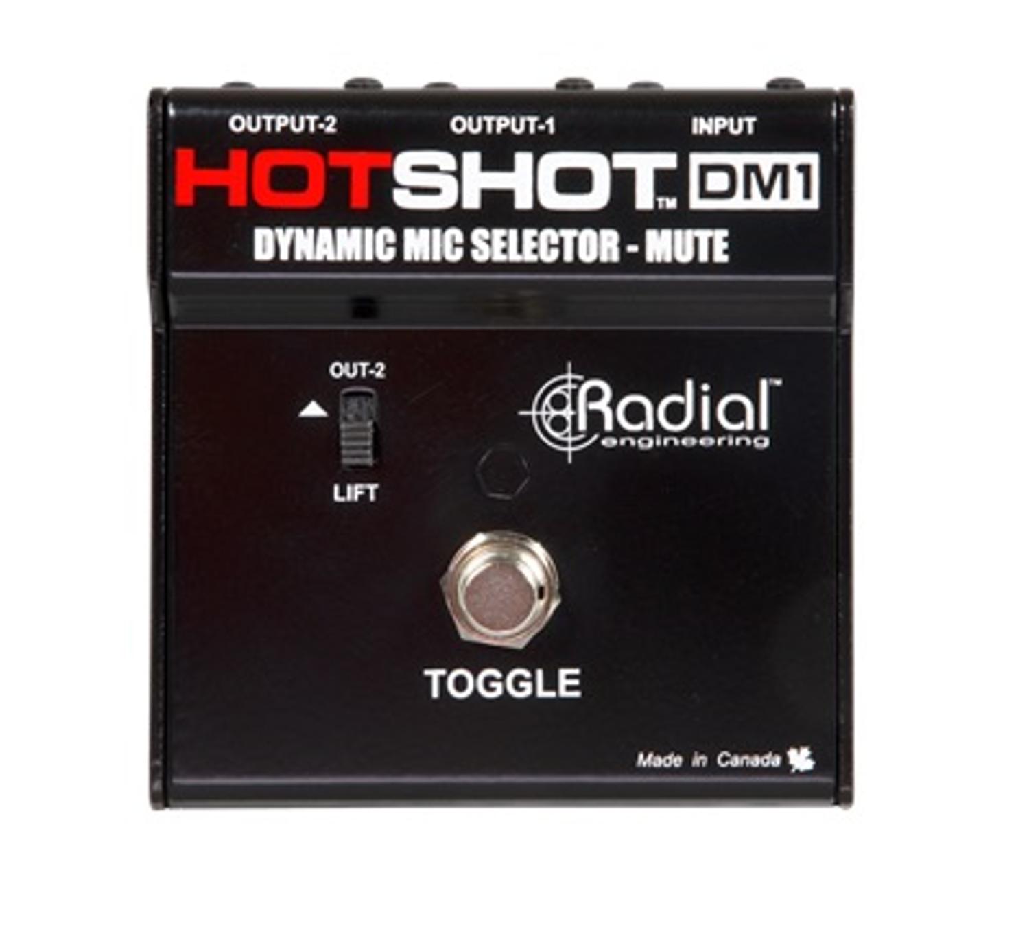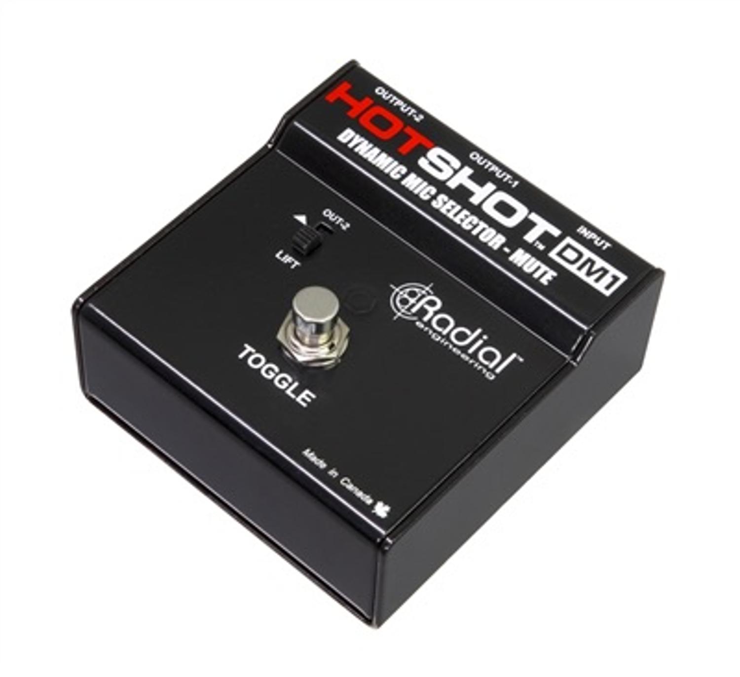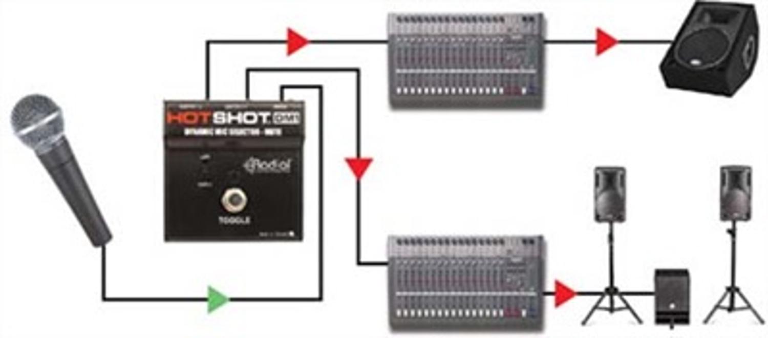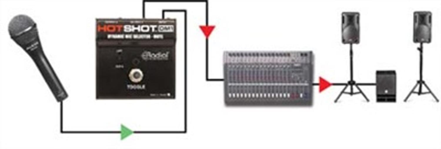 Designed to address on-stage communication problems for artists who employ in-ear monitoring systems, the HotShot™ DM1 is a combination microphone signal splitter and mute switch that allows you to depress a footswitch to mute your mic and redirect the signal to the stage monitoring system or intercom to speak with band members or technicians while on stage.