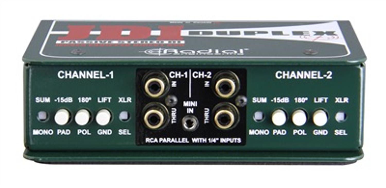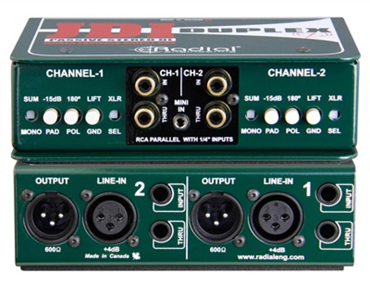 This 'Swiss Army knife' DI is equipped with ¼' connectors for instruments, RCA connectors and a 3.5mm TRS for unbalanced -10dB consumer electronics plus XLR inputs for +4dB professional line sources. Radial's innovative book-end design provides protective zones on the front and rear to keep connectors and switches out of harm's way. The 14 gauge I-beam inner frame adds tremendous rigidity to eliminate outside stresses that could torque the PC board and cause premature solder joint and trace failure. The steel outer shell couples with the transformer's MuMETAL® shield to protect against stray magnetic fields from power transformers or lighting systems that could cause interference. Finally, a full-bottom no-slip pad works double-duty by providing both mechanical and electrical isolation. The Radial Duplex delivers outstanding connectivity, superlative audio and quiet dependable performance..