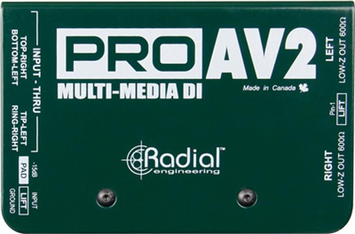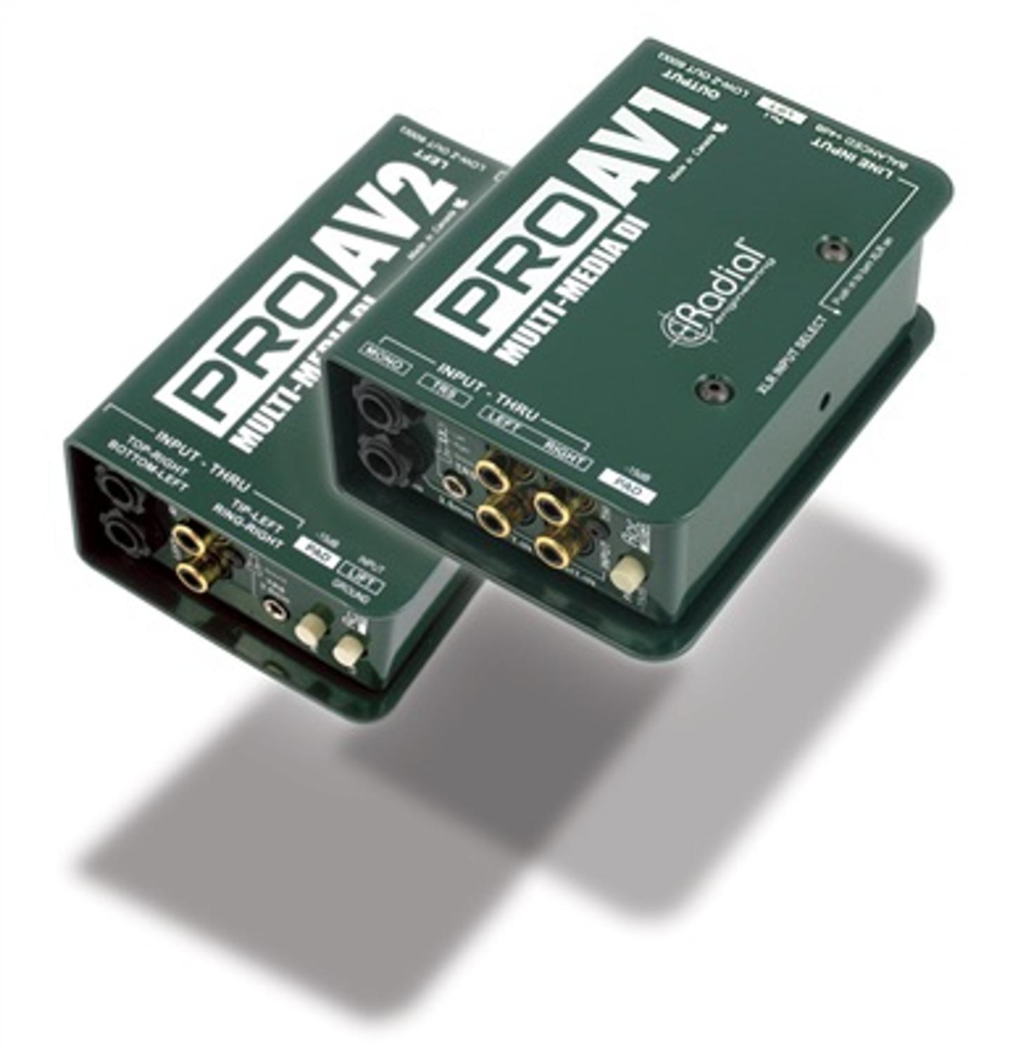 The Radial ProAV1 and ProAV2 are passive direct boxes specifically developed with the audio-video integrator in mind. The ProAV1 features a variety of stereo inputs that are summed mono via a resistive mixer, greatly simplifying signal management. The ProAV2 delivers two discrete channels where full stereo functionality is required.