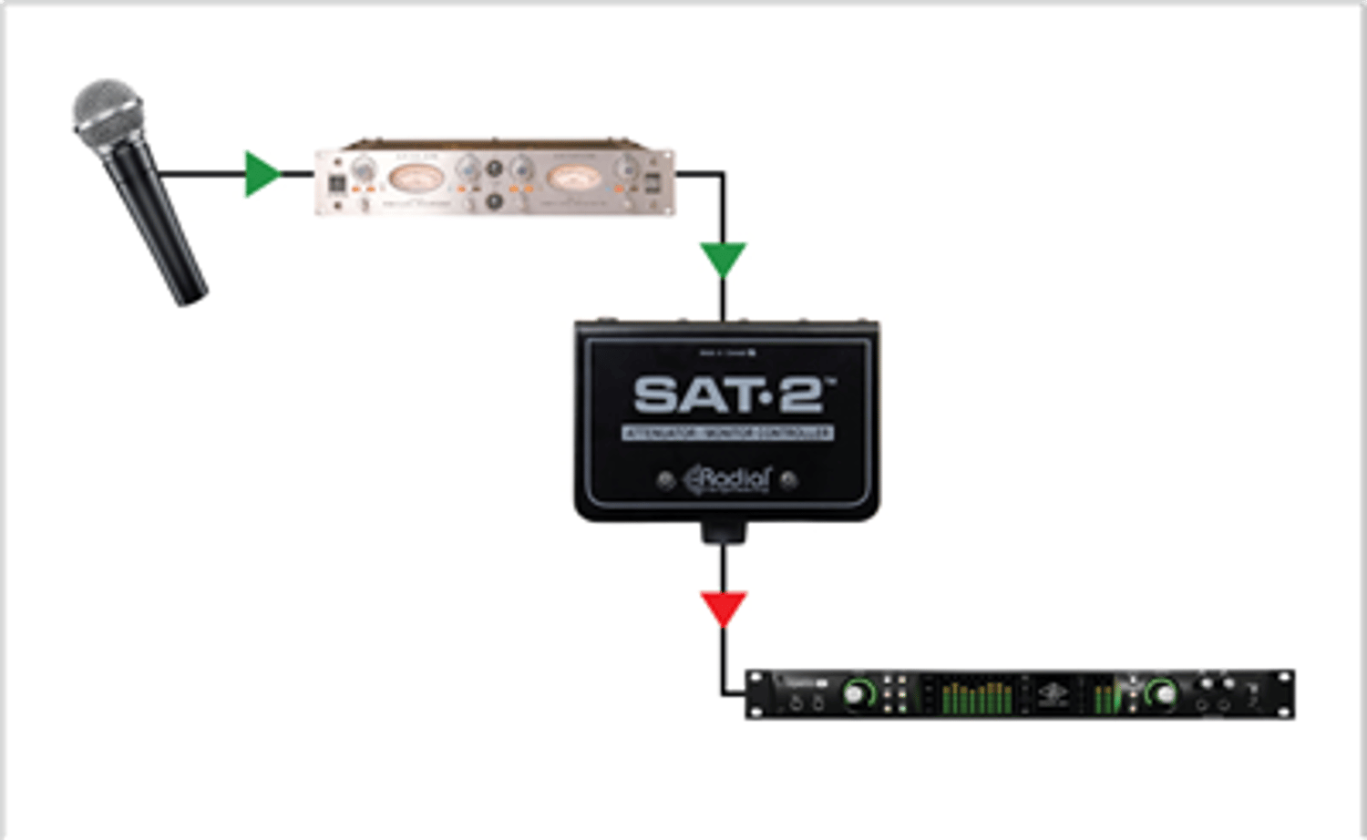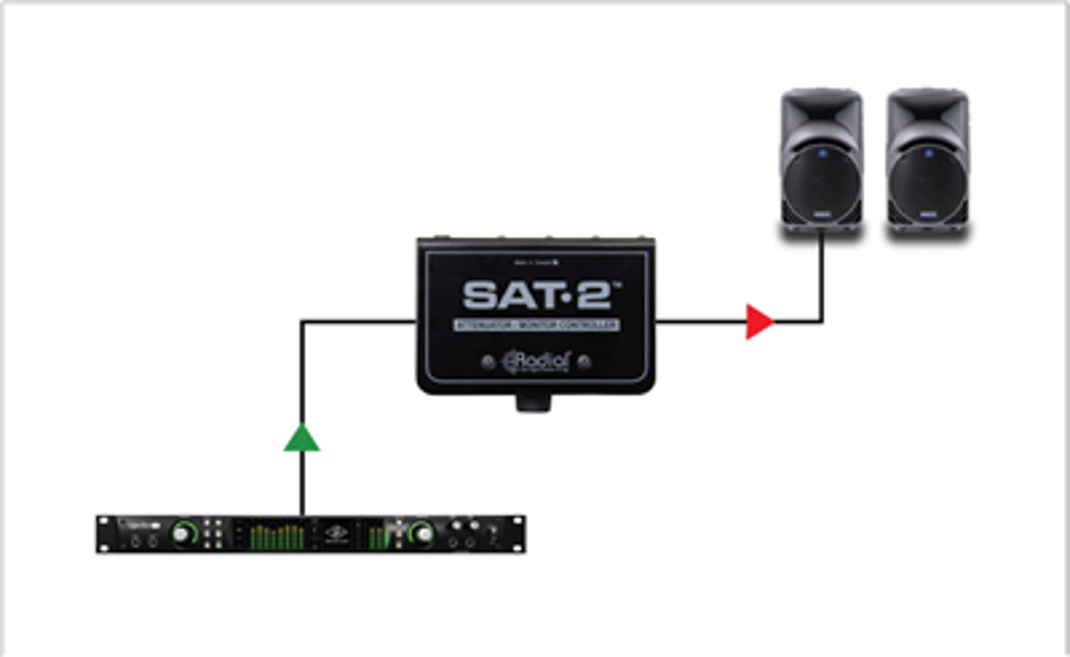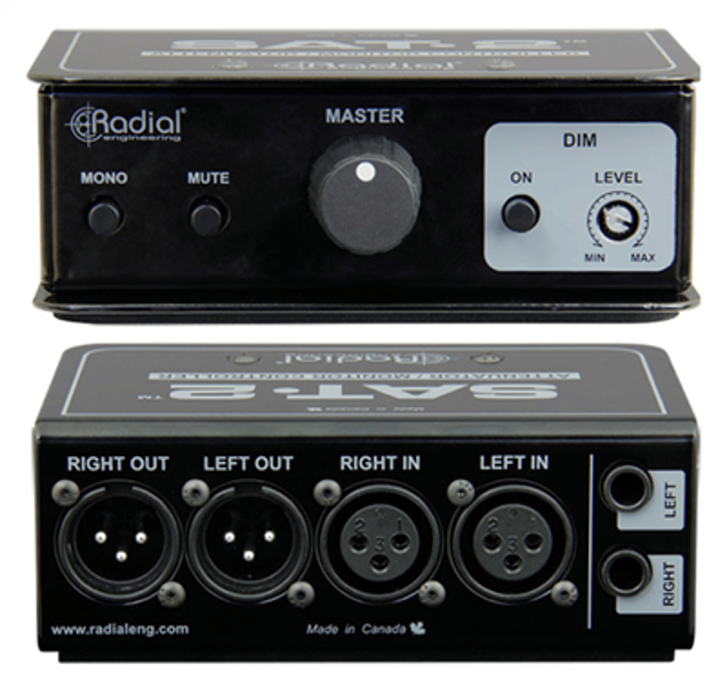 When using the SAT-2 as a monitor controller, simply connect it in between your playback device or recording interface and a pair of powered speakers. The SAT-2 is equally useful in a recording studio or with a simple PA rig to control the overall output levels. Both XLR and ¼" TRS options are provided for the inputs of the SAT-2, eliminating the need for adapter cables. XLR outputs connect to your speakers, while the trim knob provides an easy-access master volume control. Mute and mono switches allow you to silence the outputs or sum left and right together to check mixes for mono phase compatibility. A handy dim switch with adjustable level control allows you to temporarily lower the output volume without losing the setting on the main trim control.