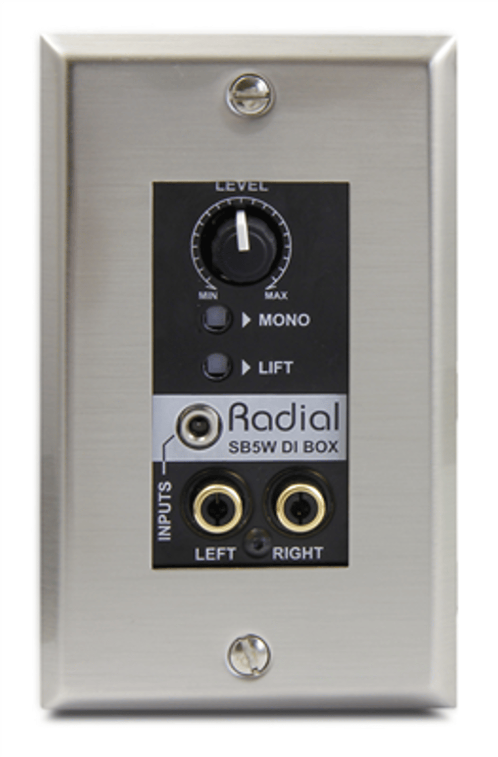 The Radial SB5W is a stereo direct box made to fit in a standard single-gang electrical wall plate. This provides the AV integrator with a simple, yet effective means of connecting an unbalanced analog audio source such as the headphone output from a laptop computer, iPhone, tablet or line level source such as a CD player to a balanced audio system via a permanently mounted interface.