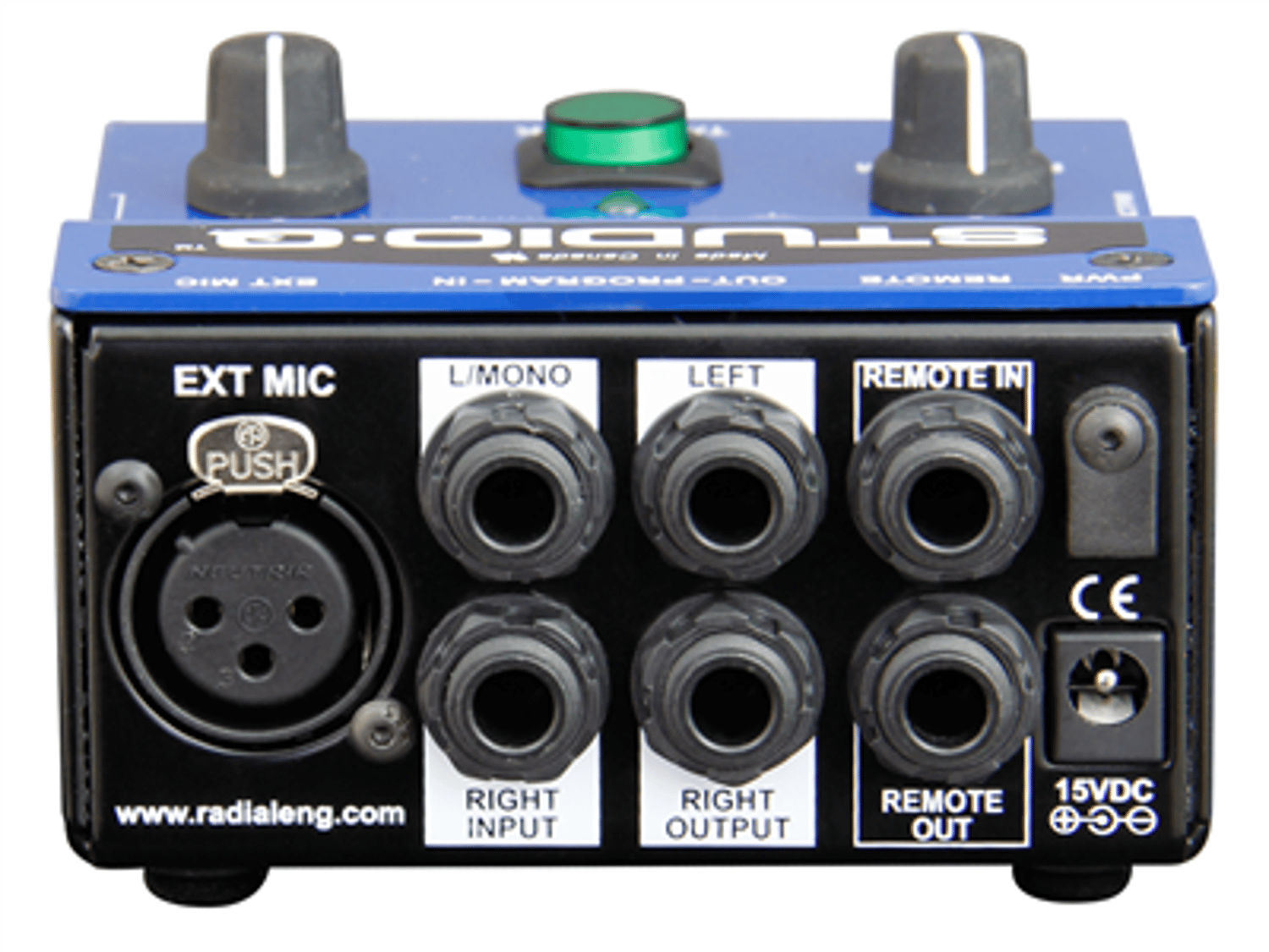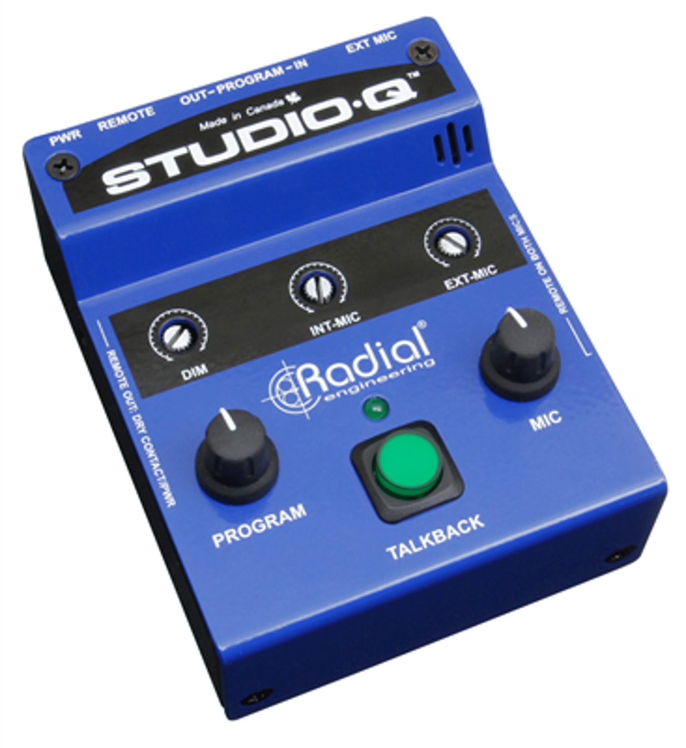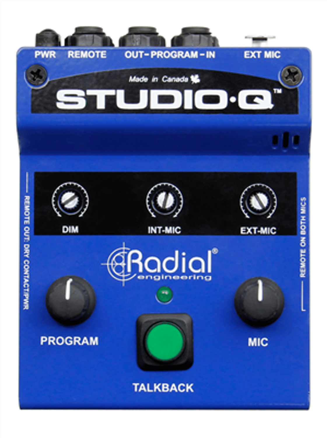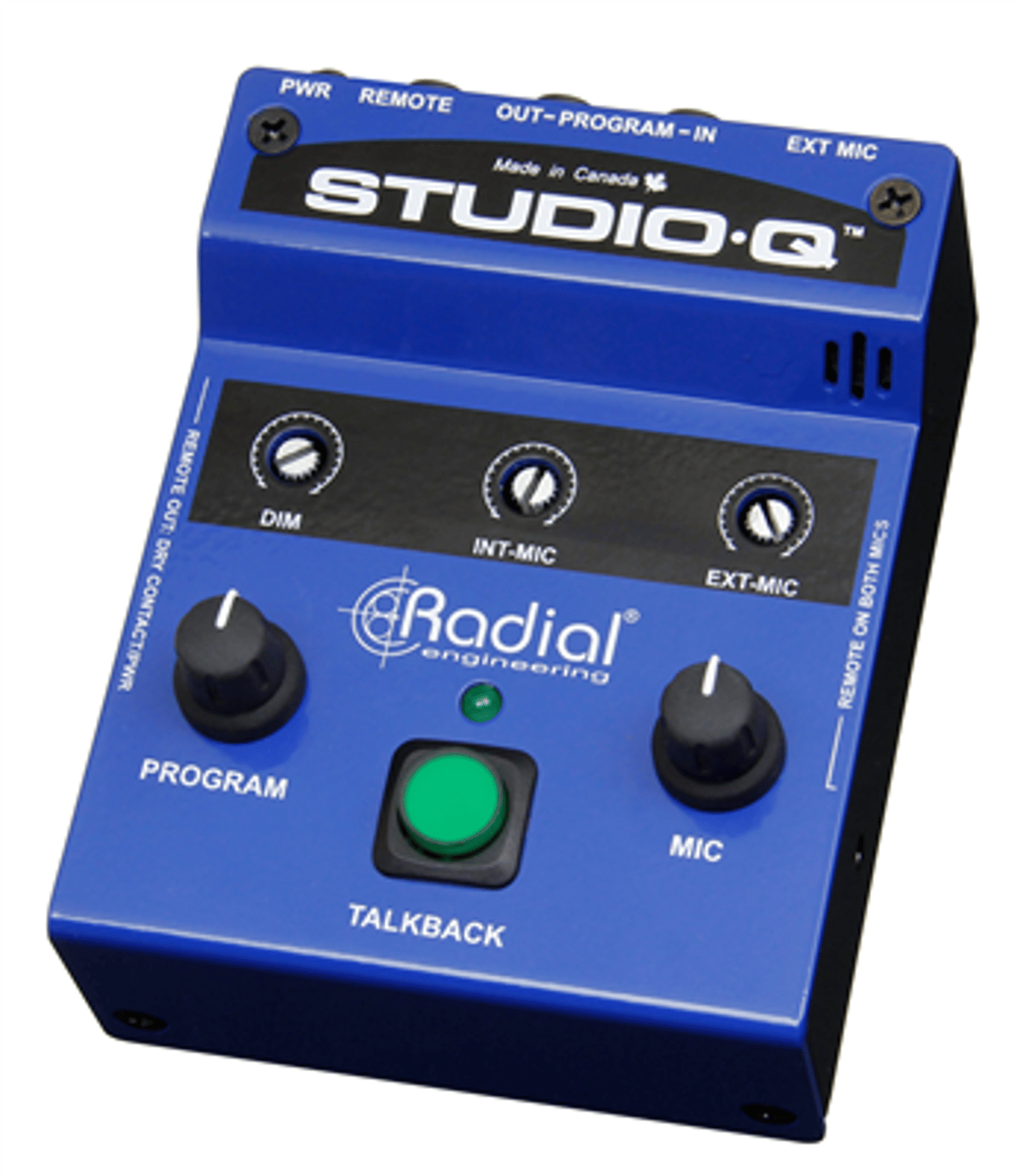 The Studio-Q begins with a simple cue switch that turns on the built-in microphone or the ‘producer’ mic XLR input. Each mic is equipped with an individual trim control along with a master mic volume. These can also be remotely activated using a remote JR1 mute footswitch.Once depressed, the signal is routed to the studio headphone system while it automatically shunts the program to the desired level. The program signal path is balanced for easy integration with any console with fully variable level control on the front panel. When the band is full-on, a remote output may be used to send a dry contact to a beacon and attract attention. This can also be set with DC power to accommodate a soon to be released LED beacon.