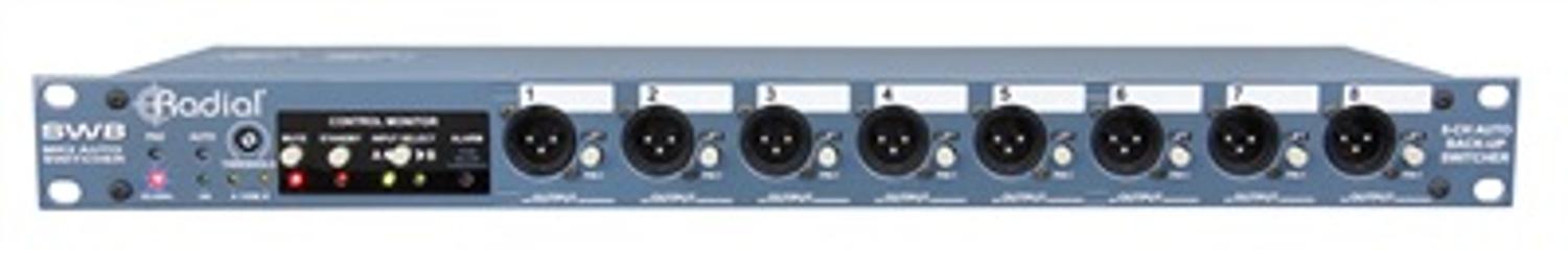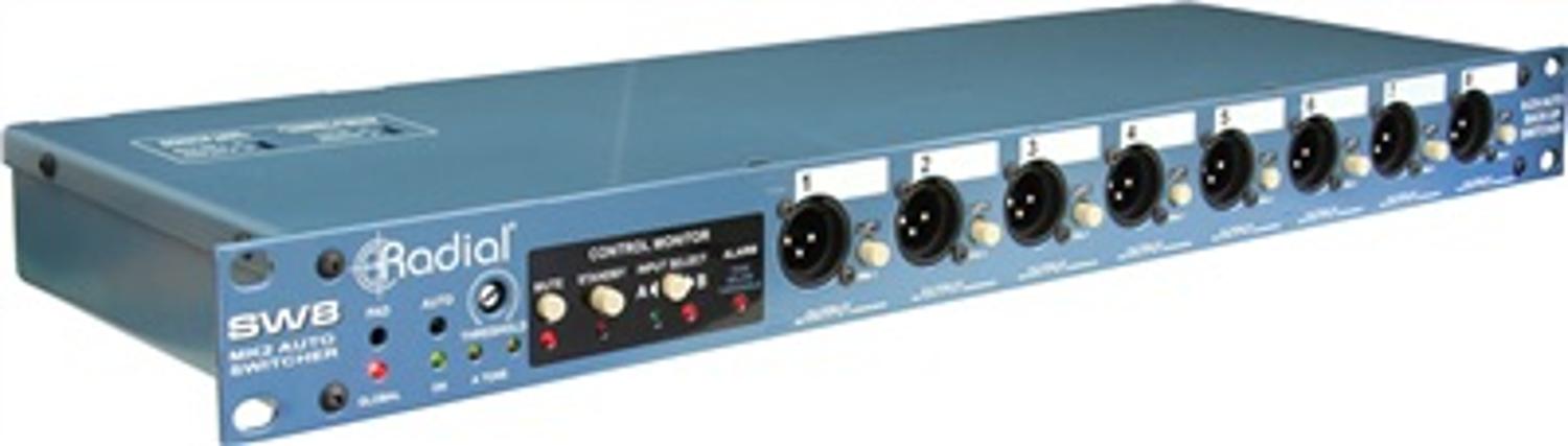 The Radial SW8 is an 8 channel auto-switcher that allows you to set up a redundant backup system by automatically switching between two sources such as a pair of digital recorders, computers or network systems.