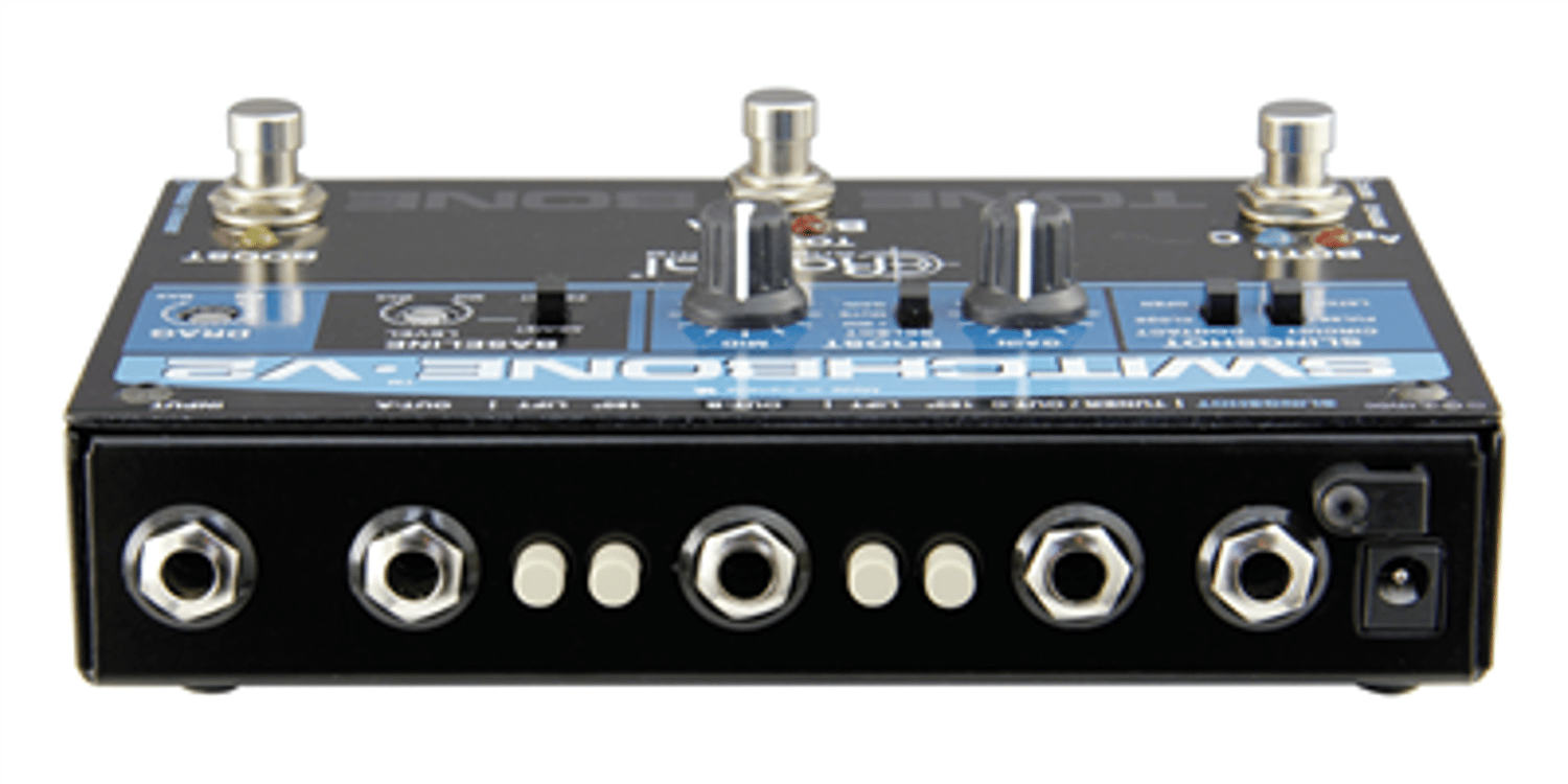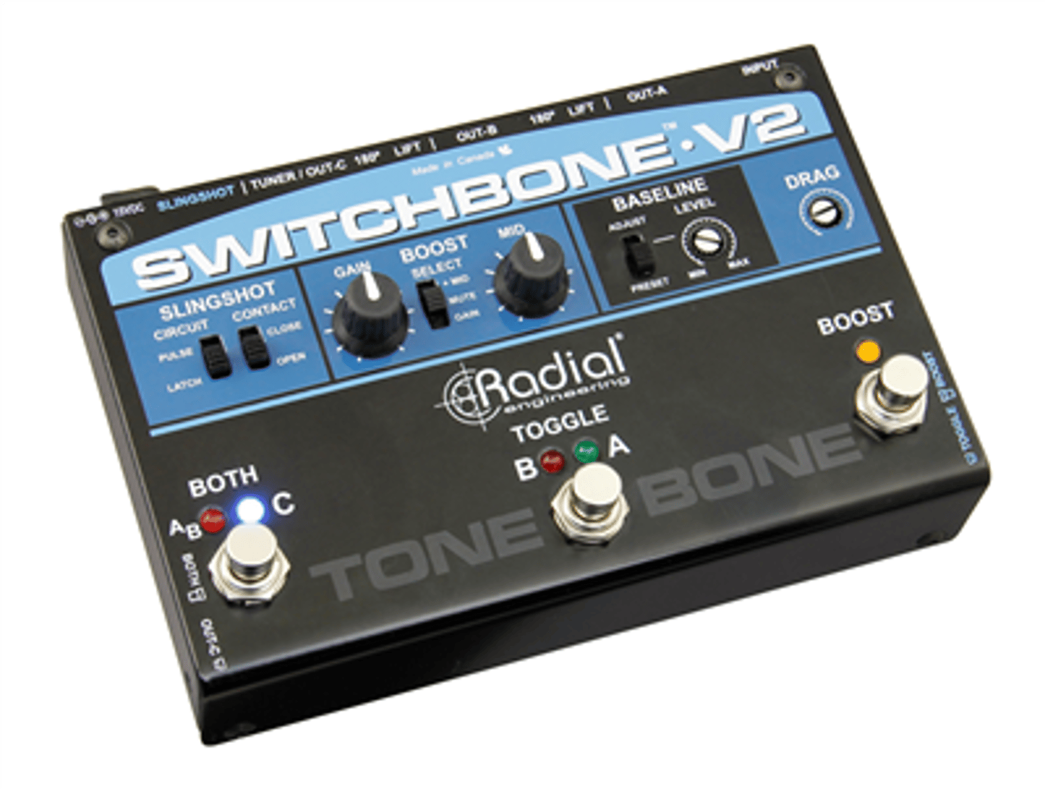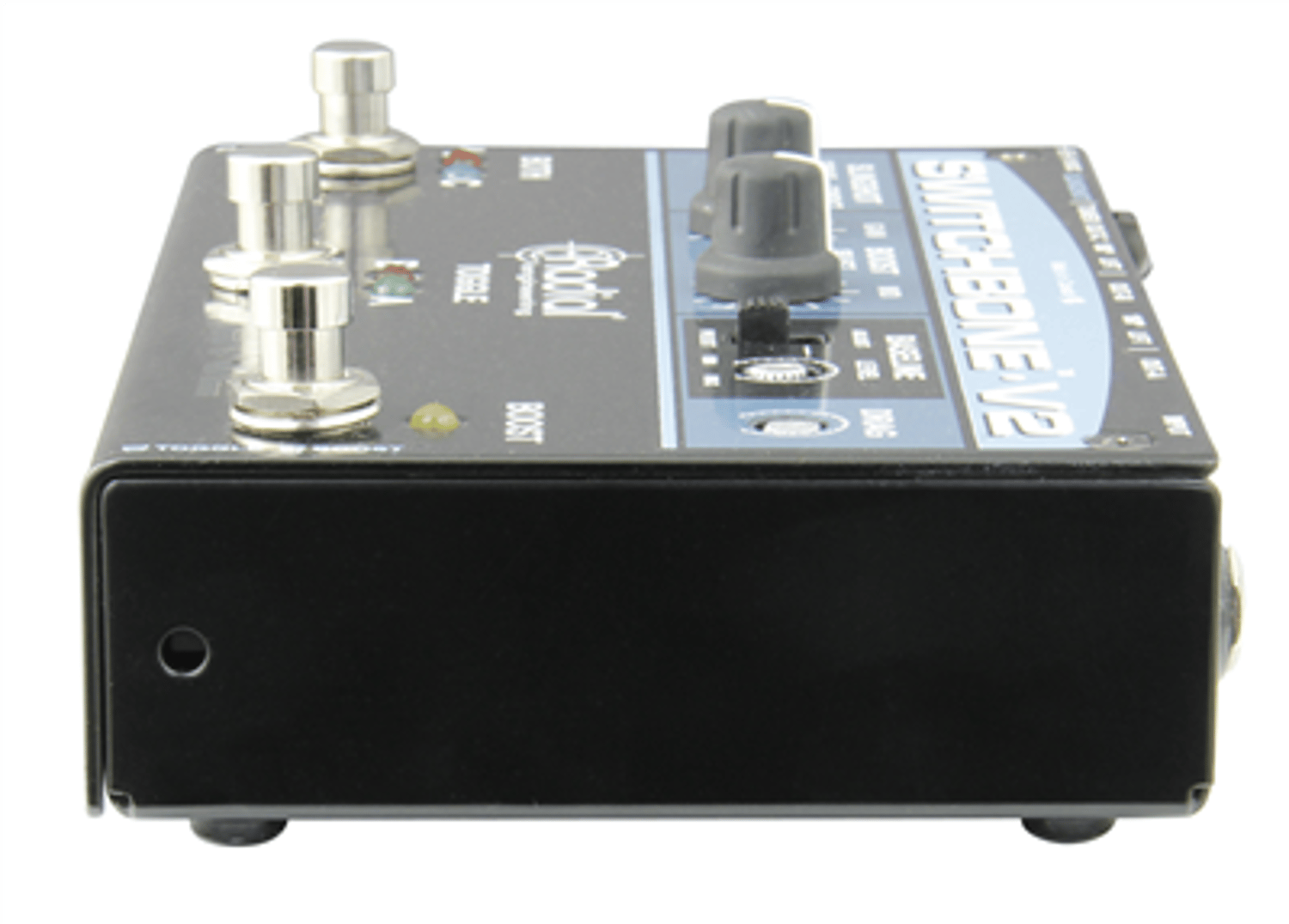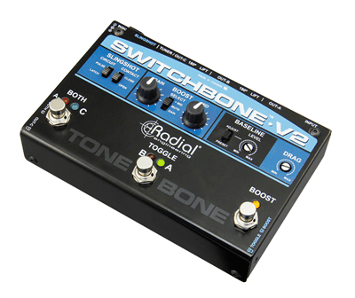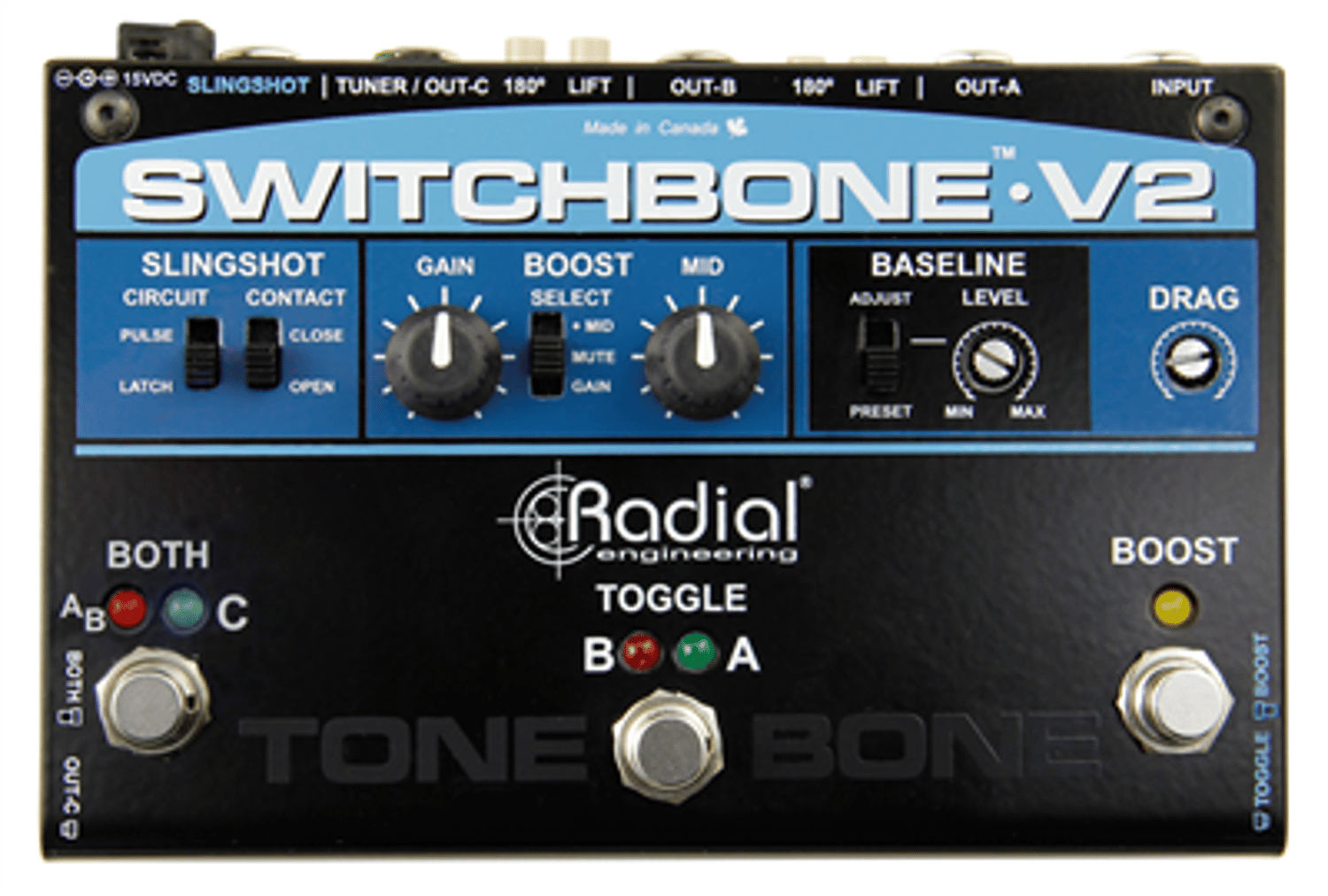 The Switchbone V2 may well be the ultimate guitar amp switcher. This device lets you switch and combine up to three guitar amplifiers without introducing distortion, switching noise, or hum into the signal path. Most importantly, it will retain the natural tone and feel of your instrument so that your natural playing style shines through. The Switchbone V2 may be used as a standard ABY switcher with both A and B outputs used separately or together, or the tuner output can be repurposed to feed a third amplifier. A built-in power booster at the output delivers up to +18db of ultra-clean boost with the option to add mid-boost for extra sustain when playing lead.