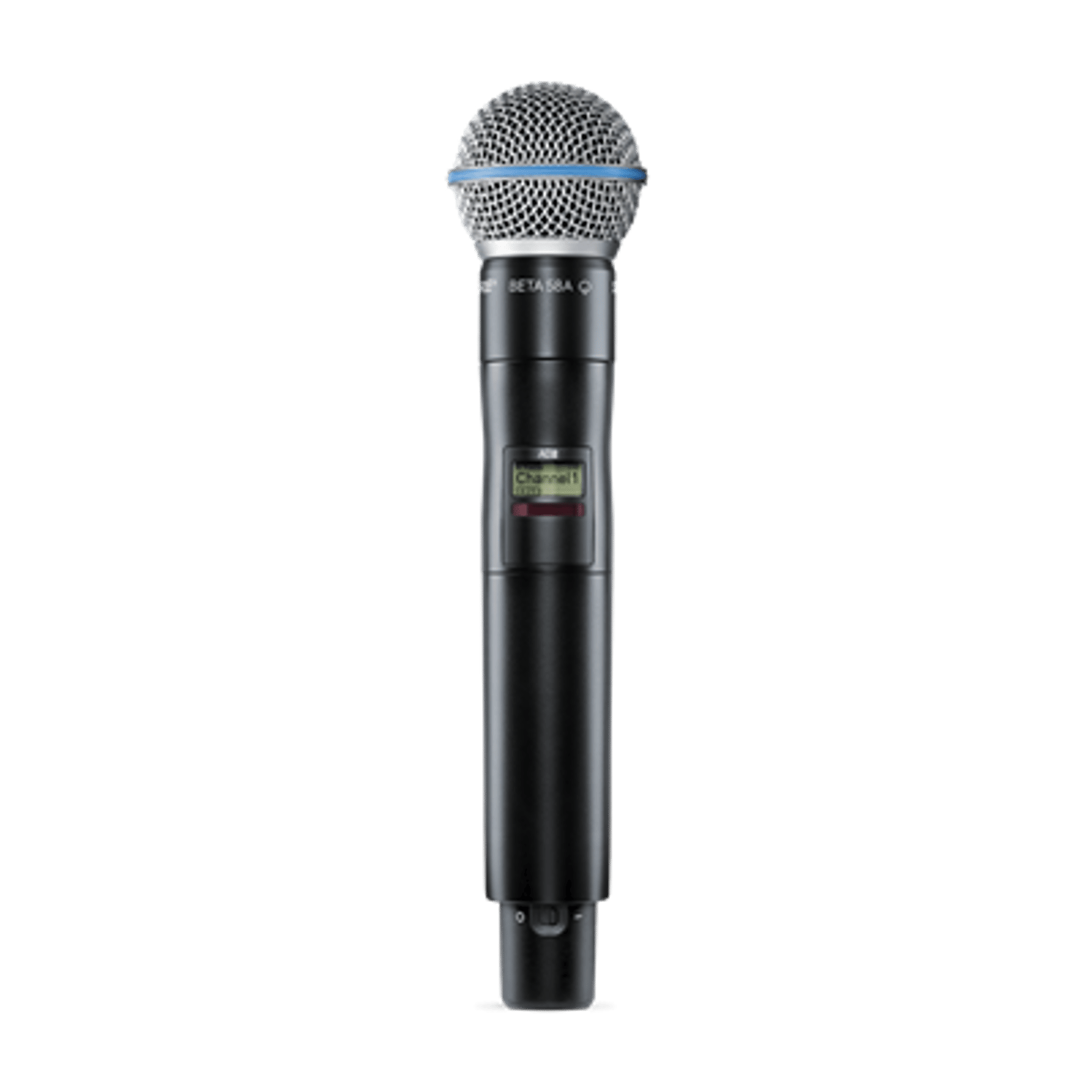 Shure AD2 with Beta 58 head, delivers impeccable audio quality and RF performance with wide-tuning, High Density mode, and encryption. Features durable metal construction, rechargeable power with dockable charging, and black or nickel finish options.