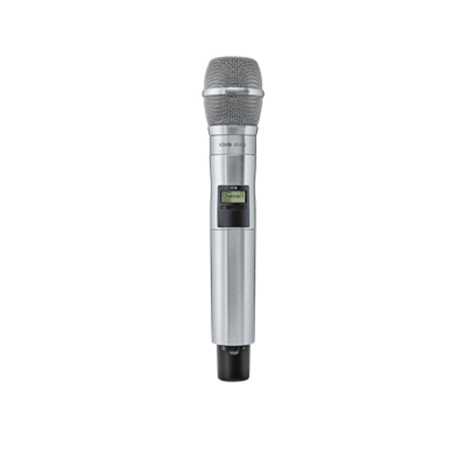 Shure AD2 with K9N head (nickel), delivers impeccable audio quality and RF performance with wide-tuning, High Density mode, and encryption. Features durable metal construction, rechargeable power with dockable charging, and black or nickel finish options.