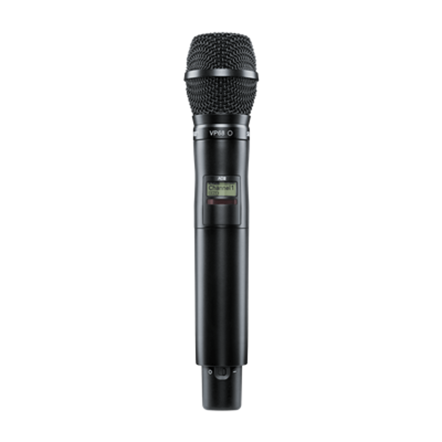 Shure AD2 with VP68 head, delivers impeccable audio quality and RF performance with wide-tuning, High Density mode, and encryption. Features durable metal construction, rechargeable power with dockable charging, and black or nickel finish options.