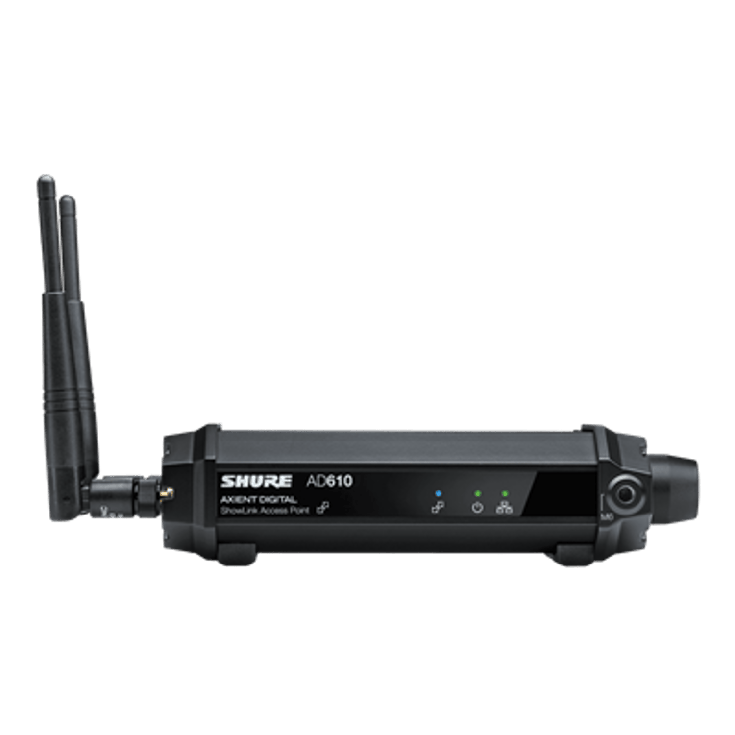 Wireless network connectivity between all linked transmitters and access points Enables real-time wireless remote control of up to 24 transmitters per access point ShowLink® offers ability to adjust gain, change frequencies, mute signals, and more True Diversity antenna scheme maintains a robust link in the 2.4GHz frequency range Automatic channel selection scans the 2.4GHz range for the best channel. Scans can be saved for future analysis in Wireless Workbench Automatic frequency agility moves the network to the best available channel if single degrades High power option for extended range, accessible via Wireless Workbench (region-dependent) Compatible with Axient Digital ADX series and Axient analog systemsThe AD610 ShowLink® access point enables real-time remote control of all ShowLink-enabled Axient® transmitters, including both ADX and AXT series models. The access point allows comprehensive management of transmitter parameters from the receiver or Wireless Workbench® using 2.4 GHz (IEEE 802.15.4) wireless communication. All parameter changes occur without interruption to the performer.