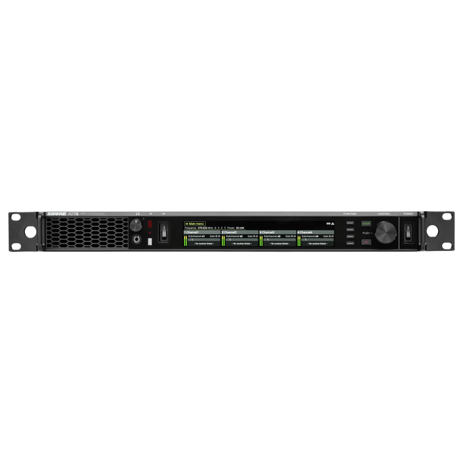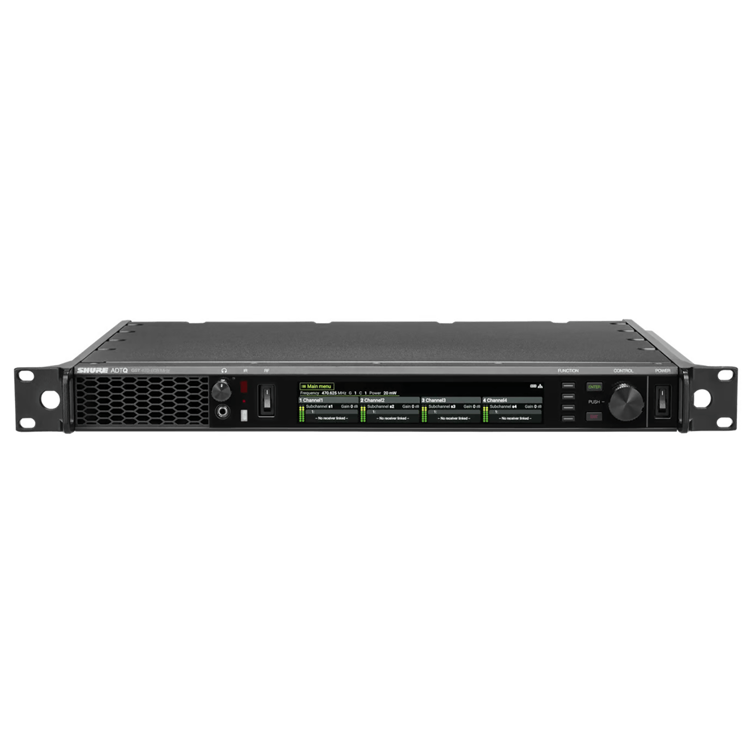 Four-radio, digital wireless stereo transmitter for Shure Axient Digital PSM in-ear monitoring system Powered by Shure WMAS innovation*, ADTQ delivers flexible, pioneering spectral efficiency and access to scalable channel count** Patented Spatial Diversity transmission defends against multipath interference Four different transmission modes to choose from: Multichannel Wideband – Shure WMAS innovation* powers the ADTQ to deliver up to four stereo audio channels, not just one, with each ADTQ radio Narrowband – Access more RF output power for greater range with this traditional option Analog FM – Achieve virtually zero latency performance with updated hybrid technology Axient Digital Standard** – Turn the ADTQ into an AD series Axient Digital transmitter and send high-quality, long-distance wireless audio to any Axient Digital wireless receiver Wide tuning range to cover more cities, festivals, and events on tour Real-time remote control of all ADXR bodypack wireless receiver parameters from the monitor mix position and elsewhere with exclusive ShowLink technology Encrypted RF signal ensures every transmission is secure Five-segment Channel Quality meter displays RF signal-to-noise Large, 6.6-inch front panel color display Networked control with Shure Wireless Workbench for extended and enhanced RF monitor and management Optional internal antenna combining reduces or eliminates external combiners